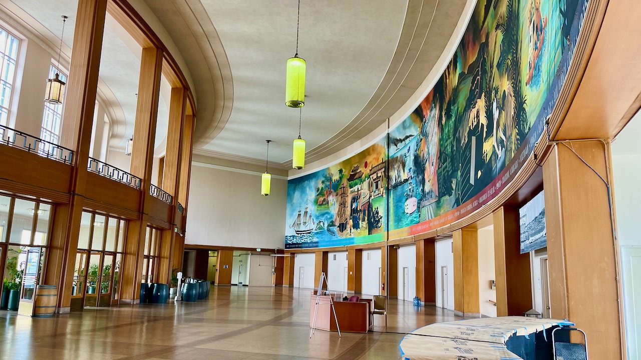 中に入ると、贅沢な空間が広がります。実はT.I.は、1937年から始まった埋立地で、1939年にゴールデンゲート博覧会(The Golden Gate International Exposition )が開催されました。その後、海軍が引き継ぐ形になり、ビルは本部として機能していました。