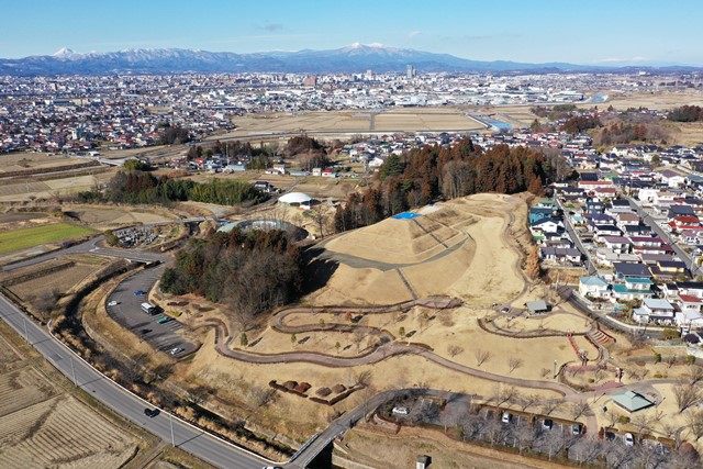 (以下、空撮編)南東側より、郡山市街地をバックに公園の全景を俯瞰します。奥には、磐梯山や安達太良山、蔵王連峰などの山々が確認できます。