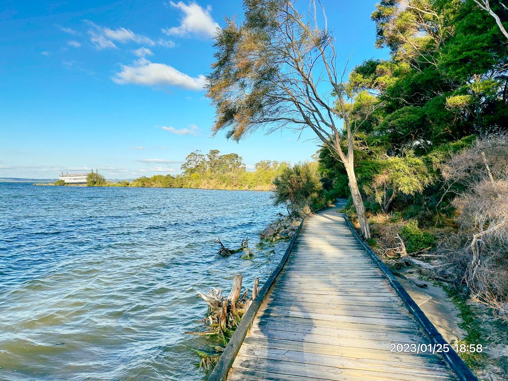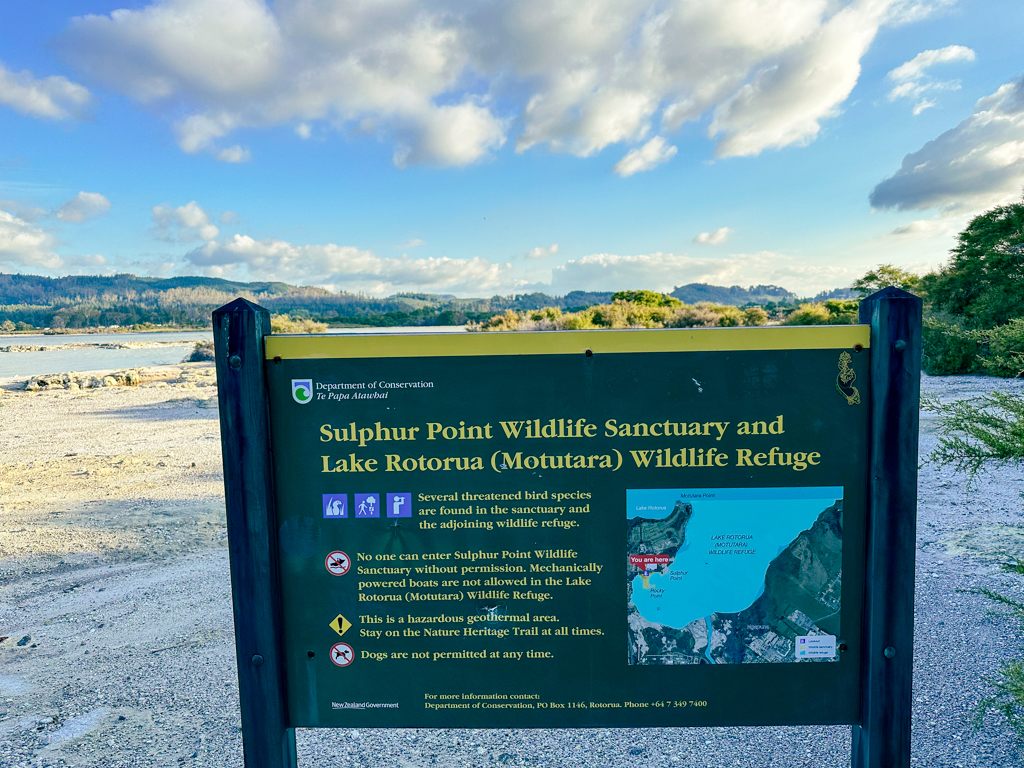 ロトルア湖畔には、散策路が整備されています。早速ジョギングで廻ってみました。途中には何か所か火山性の有毒ガスの噴出エリアがあり、硫黄臭がしていて、注意するようにとの看板がありました。
