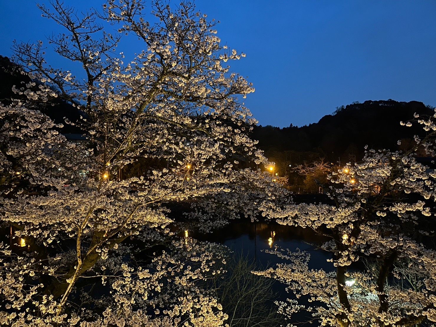 うっすらライトアップされた桜、さらにこの日は雨が降っていたので尚更趣がありました。
