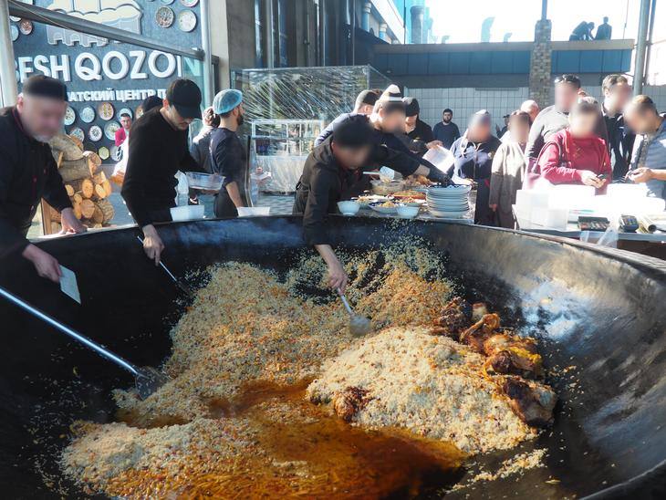 ウズベキスタンの食事で嬉しいのは、日本人になじみ深い米料理や麺料理がごく普通に食べられていることでしょう。まずご紹介するのは押しも押されもせぬウズベク料理の代表格、肉と野菜の炊き込みご飯プロフ(ラテン文字表記plov/キリル文字表記плов)。プロフはピラフと同じ語源の言葉で、他にオシュ(osh/ош)と呼ばれます。このオシュという言葉はプロフという意味だけでなく食事全体を指す言葉でもあり(例:オシュホナ=直訳すると「オシュの部屋」、転じて食堂や台所の意味)、日本のご飯という言葉にそっくりそのまま当てはまります。それほどウズベク人にとって重要な料理で、日常食としてもハレの日の食事としても食べられます。また木曜日はプロフの日とされています(が、そんなの関係なくほぼ毎日プロフを食べる人も多いです…)。