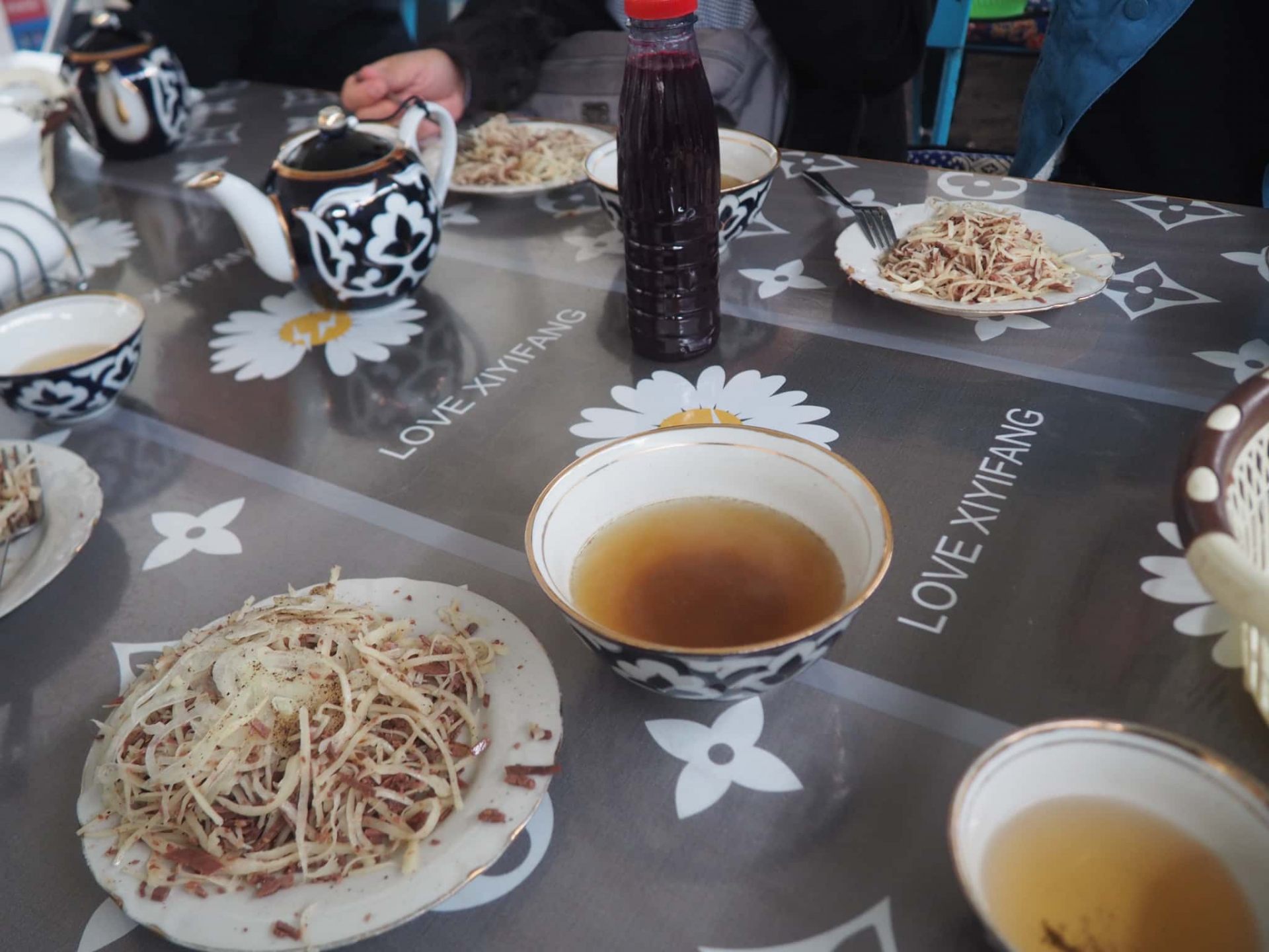 お隣カザフスタンやキルギスではよく食べられる馬肉ですが、ウズベキスタンではなぜか食べるのはほぼタシケント市民のみ。この馬肉を使ったタシケントの郷土料理、ご当地グルメがノリン(norin/норин)です。柔らかい細切り状の麺にこれまた細切りにした馬肉を混ぜたもので、あまり麺料理らしくない出で立ち。観光名所にもなっているタシケントの市場チョルスーバザール(39. チョルスーバザール徹底ガイド!タシケント最大の市場を大探検)の食堂街ではこのノリンの山盛を見せて売っている食堂があるので、ぜひチャレンジを。