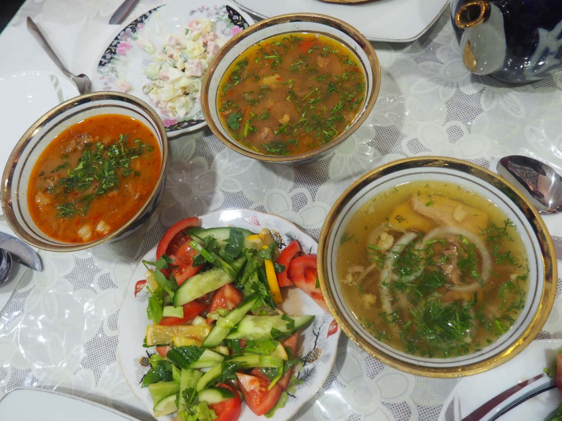 スープの代表料理はショルバ(sho’rba/шўрба ショルボとも発音)で、塩味ベースの肉と野菜入りスープ。シンプルな味付けですが、なかなか食べ応えがあります。トマトベースのスープに米が入ったマスタヴァ(mastava/мастава)はウズベキスタンの料理には珍しくそこまでオイリーではない料理なので、お腹に優しいものを食べたいときにぜひ。