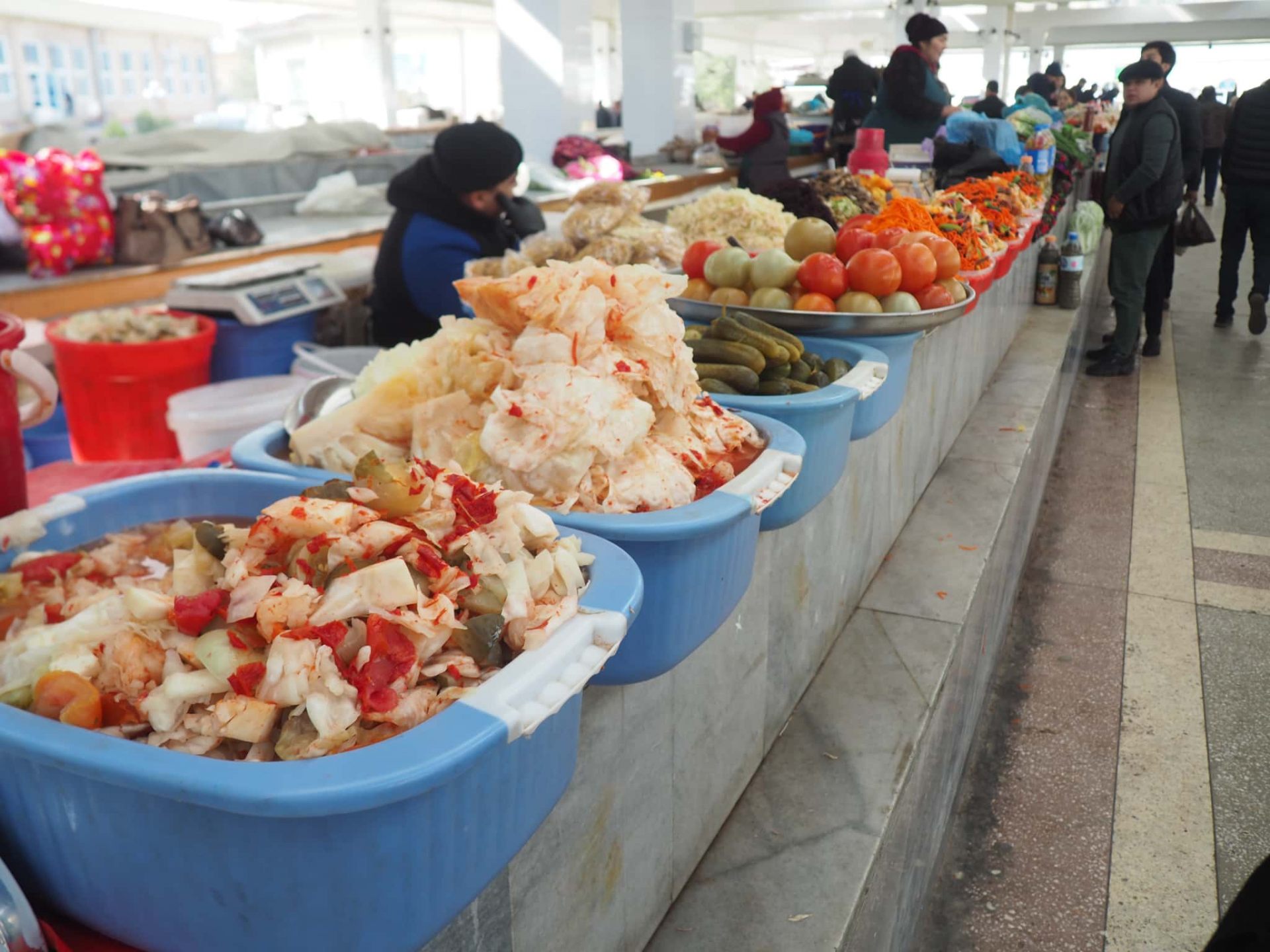 冬によく食べるのがキムチ(kimchi/кимчи)。え、中央アジアなのにキムチ!? と驚きますが、この地は第二次大戦直前に朝鮮半島から強制移住させられた、高麗人(コリョサラム)と呼ばれる朝鮮系の人々が長らく住んでおり、キムチは彼らが広めて定着させたものなのです。ただ辛い物が苦手なウズベク人向けにアレンジされ、キムチというよりピクルスといったようなすっぱい味で、これもサラダのカテゴリーに入ります。