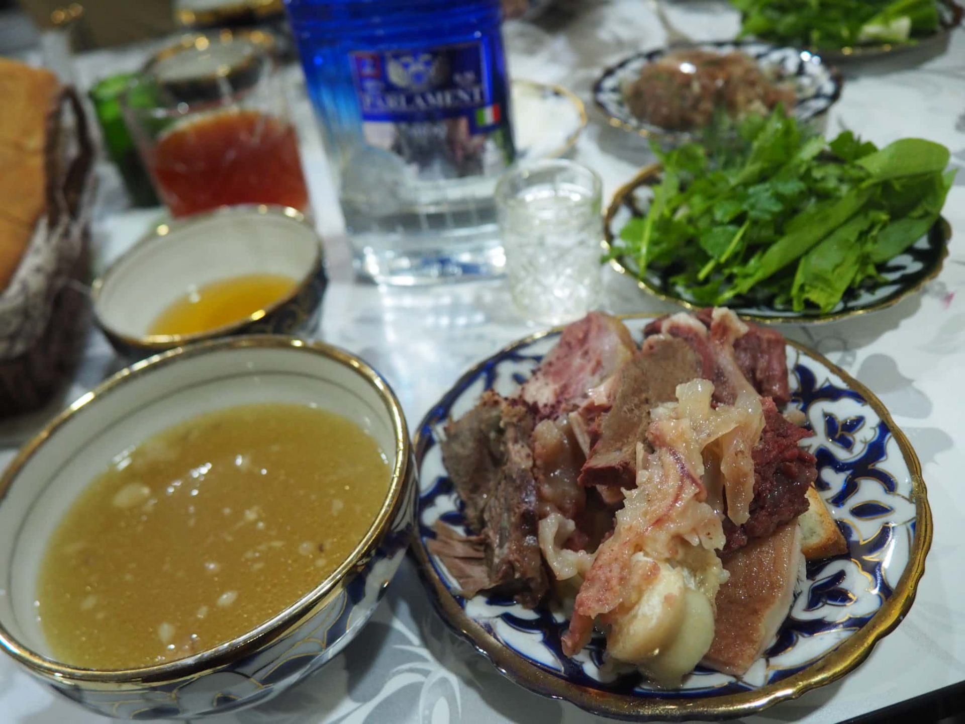 まず挙げたいのがカラポチャ(kalla pocha/калла поча)。カラは頭、ポチャは足で、その名の通り頭から足までの牛のあらゆる部位を煮込んだ肉肉しすぎる料理です。ほぼ何も味付けせず、茹でた臓物を茹で汁に付けて食うというワイルドな料理で、ウズベク人にこれを食べたというと面白がられるかドン引きされることになります。脂っこさを中和するために、一緒に出てくるサラダや香草、野菜ジュースなどと一緒に食べるのが定番。そしてよく合うお酒がウォッカで、カラポチャ専門店には夜な夜なおじさんたちが集まり、カラポチャをアテにウォッカをクイッとやっています。その雰囲気はまるで大衆もつ焼き居酒屋のよう。