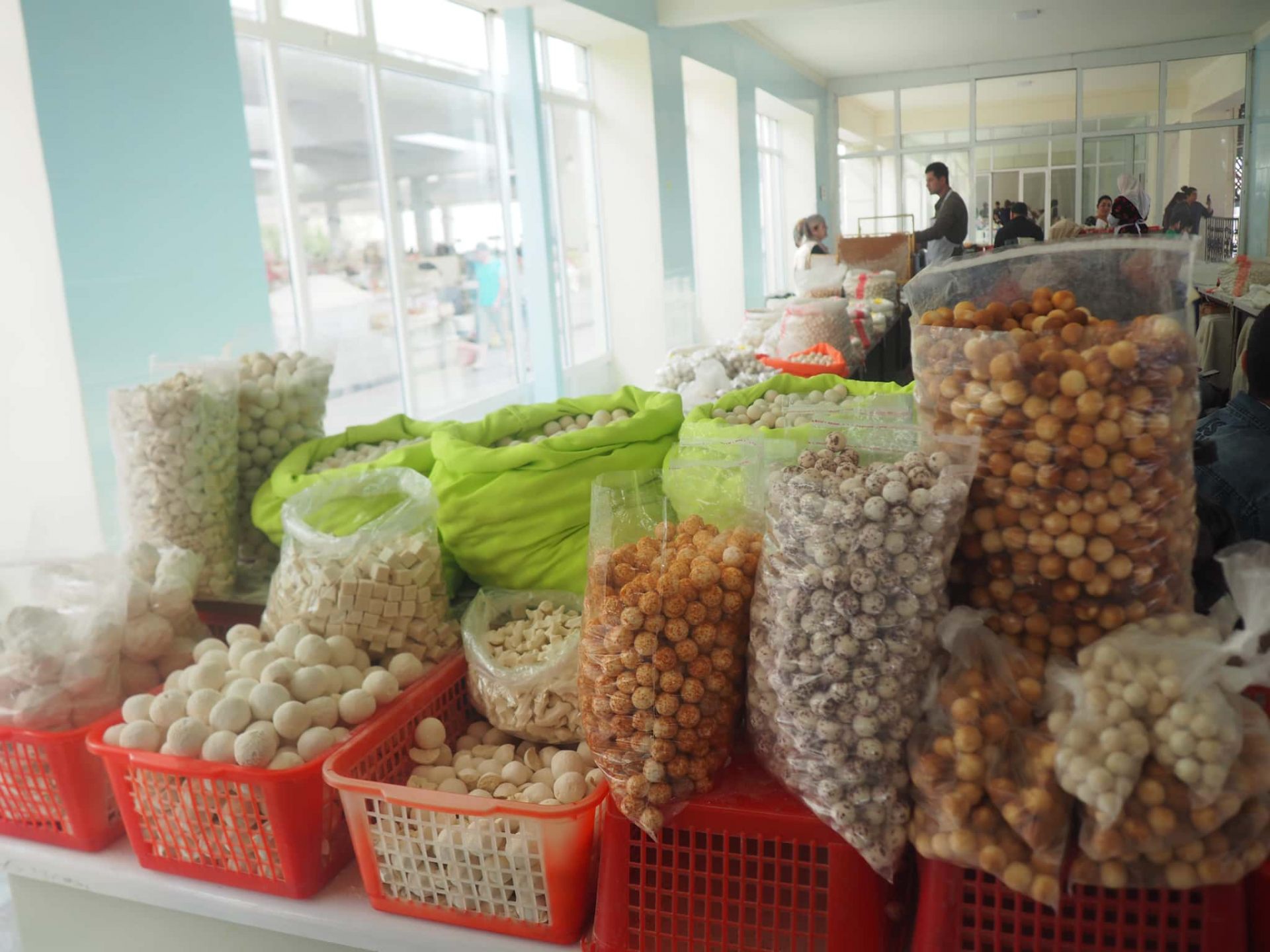 そしてバザールで見かけるかもしれないであろう、この白いボール状のもの。これはクルト(qurut/қурут)といい、ヨーグルトを固めた乳製品です。このクルトの売り場が集まっているエリアに行くと、チーズのような何とも言えないにおいが鼻を突きます。