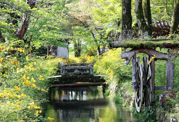 ここでは、山吹と水車や石橋などの写真映えする風景に出合えます。