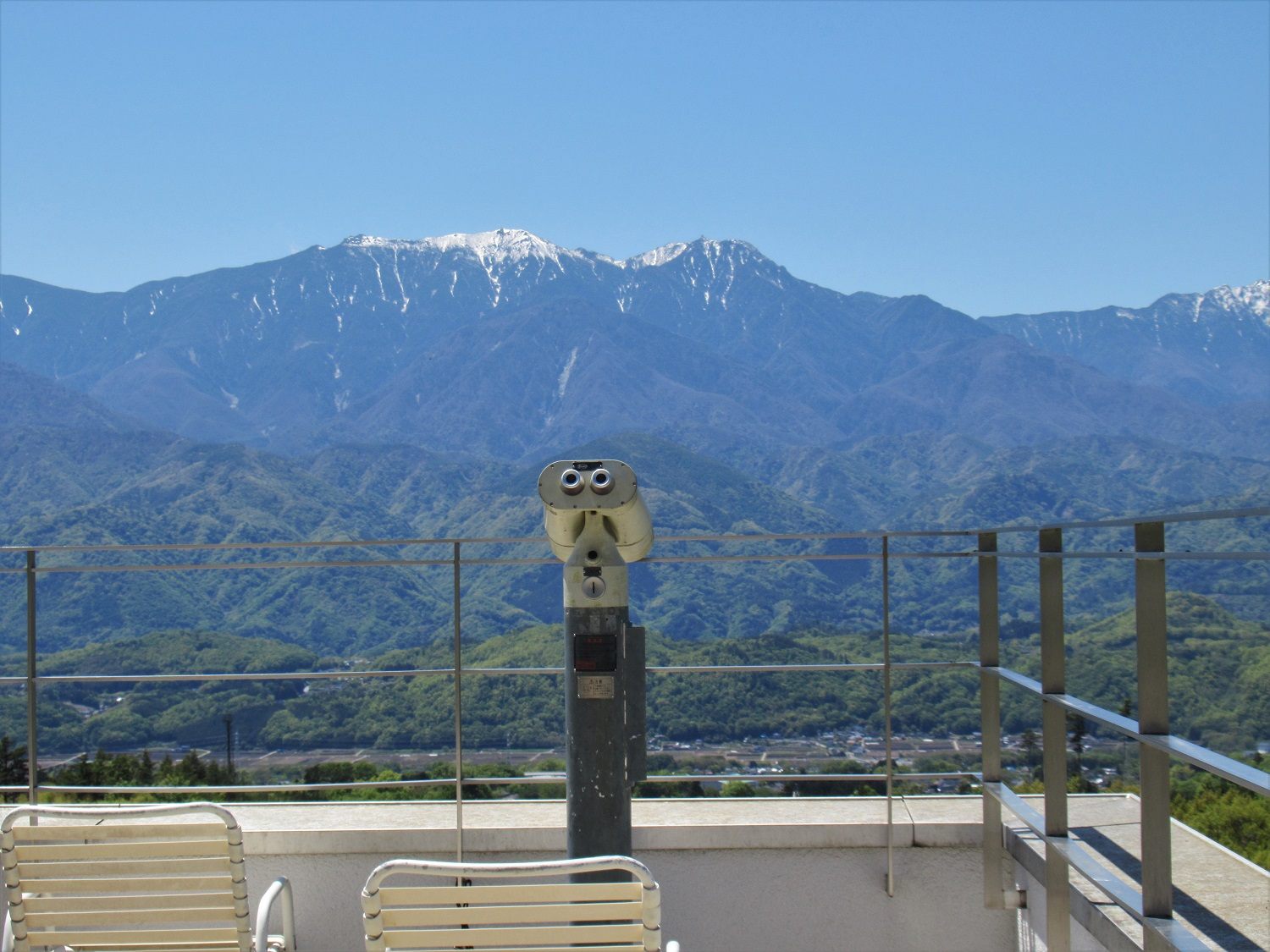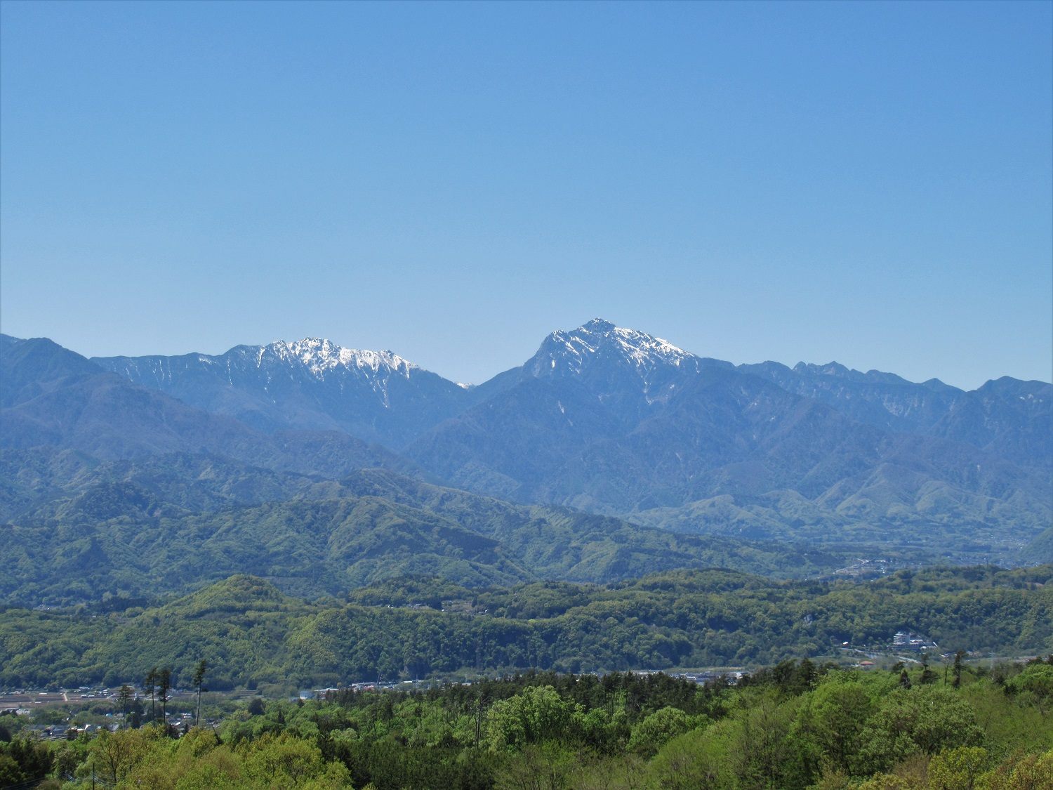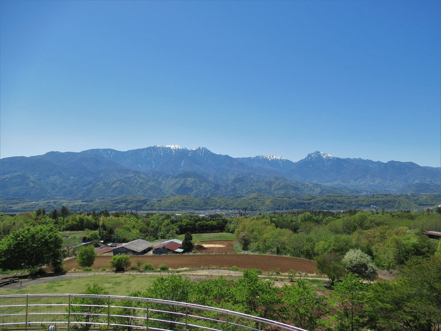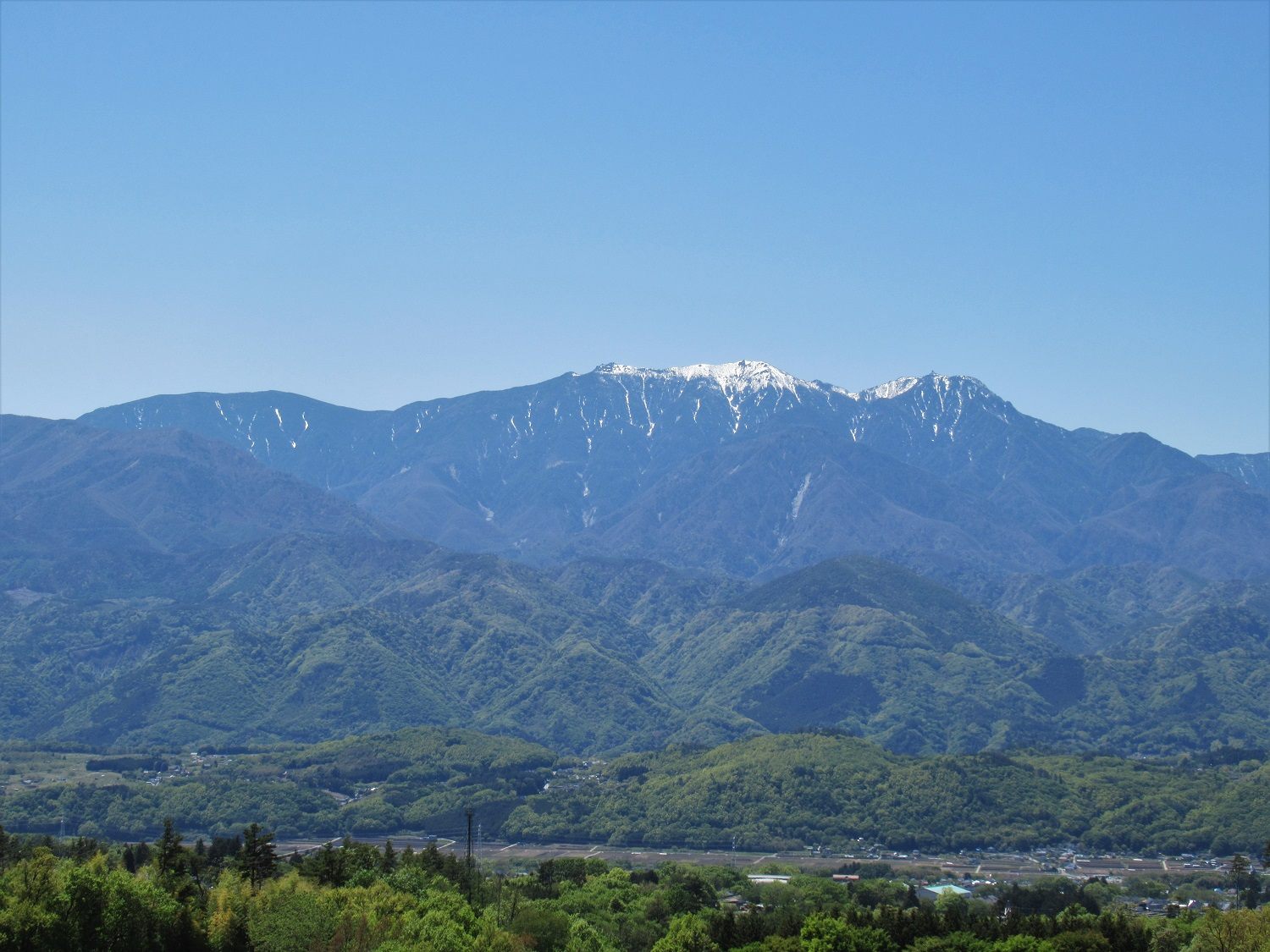 う~ん。なんて気持ちのいい風景でしょう。「南アルプス連峰」が、一度に視界に入らないくらい広がっています。この写真は、2023年4月27日に撮りました。