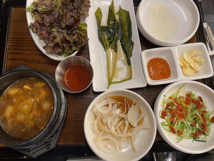 真ん中の行者ニンニクと巻いても美味しいです。左下のテンジャンチゲ(韓国味噌汁)もセットで出てきます。