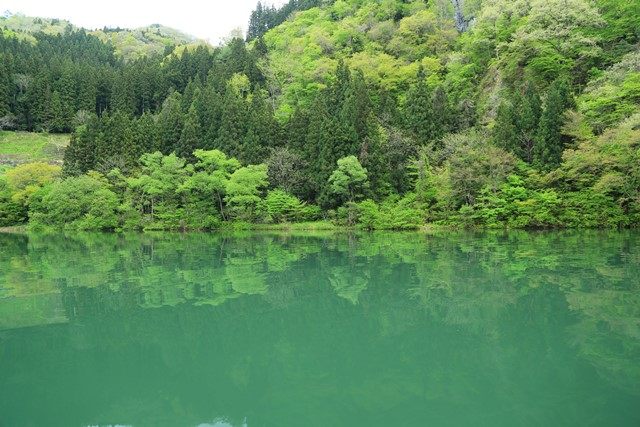 幸いにも長雨ではなく雨脚も弱かったこともあって、只見川は綺麗な色合いでした。その特徴的な"只見川グリーン"に新緑のグリーンが映えます。