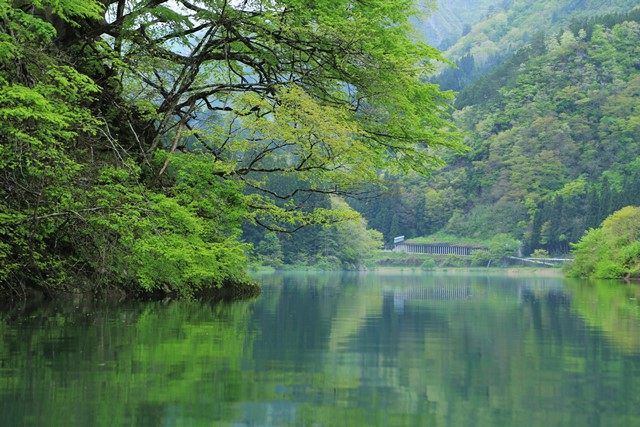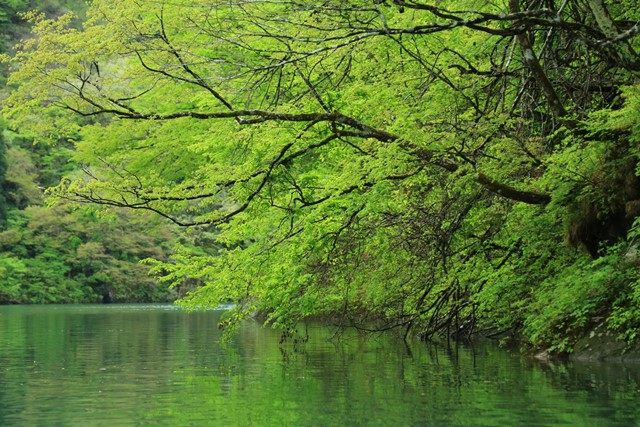 穏やかな只見川の川面と萌黄色に染まる霧幻峡は、とても美しい情景を見せてくれます。これから迎える川霧のシーズンは、より幻想的な光景を堪能できそうです。