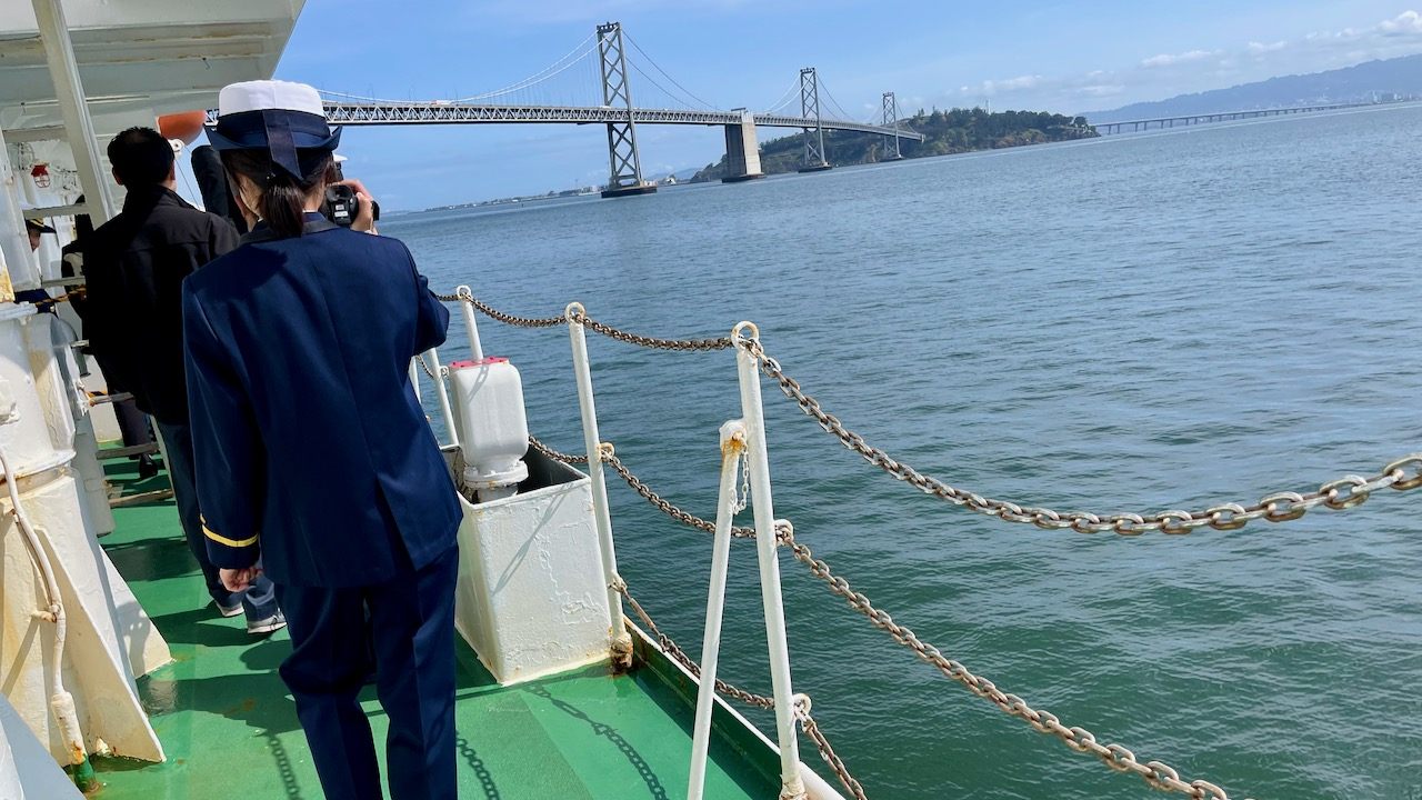 今年も、海上保安大学校の実習生が、大型練習船”こじま(PL21)”でサンフランシスコにやってきました。呉→サンフランシスコ→(パナマ運河)ボルティモア→ピレウス(スエズ運河)→シンガポール→マニラ。101日間で世界一周の遠洋航海実習。その最初の寄港地がここサンフランシスコです。