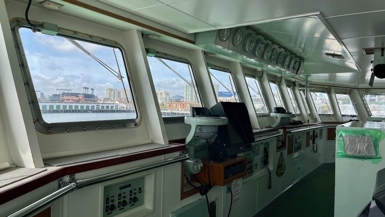 実習生の右人差し指が呉、左指は、現在停泊しているサンフランシスコピア30/32です。海図で、どこを通ってきたか教えてもらいました。4〜5月は比較的気候が安定しているのですが、今回は呉を出発して、太平洋に出た4月27日、28日、低気圧と一緒に航行するようになってしまい、大きなうねりで船は大揺れ!実習生ほぼ全員船酔いになってしまったそうです。個人差で軽く済んだ人もいたそうですが「僕は酷くてトイレに入りびたり状態でした…」とやや苦笑いの実習生…辛かったよね、よく頑張りました。