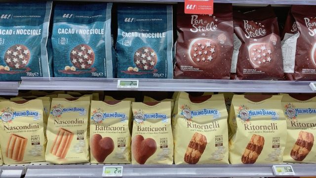 イタリアのスーパーはお菓子のゾーンがとにんかく広いです。