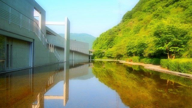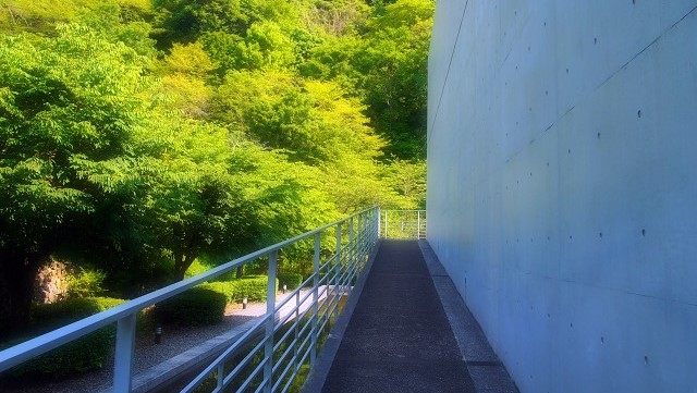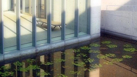 「流水の庭」から美術館を見ると建物と緑がV字を描き出し、水鏡として写り込んでいたのが印象的でした。