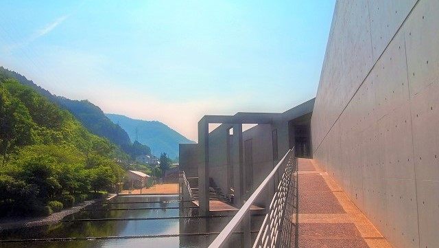 現在の美術館は成羽陣屋跡の石垣の上に建てられ、設計は、建築家・安藤忠雄氏です。コンクリート打ちっぱなしの建築物と周囲の成羽の山並みや自然とが調和し、この建築物自体が美術作品として一目置かれているそうです。