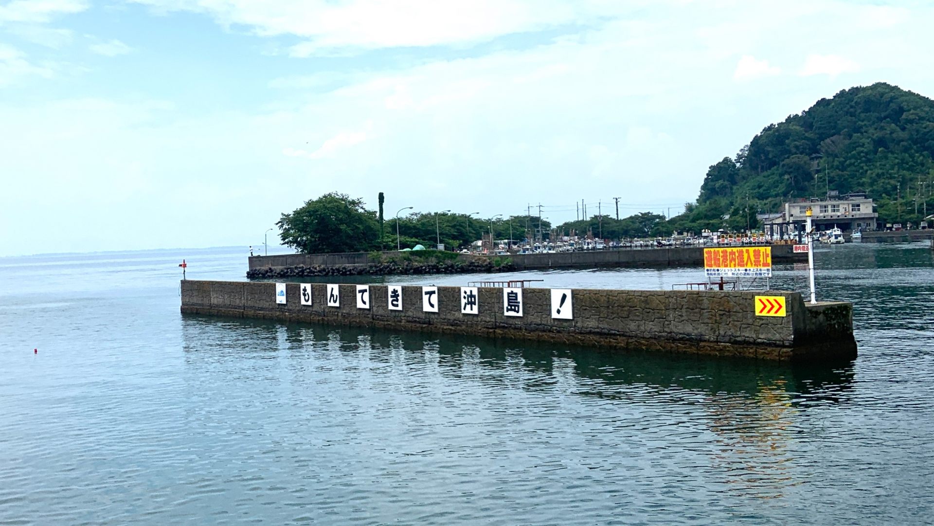 大津港より約1時間20分で沖島に到着。沖島は近江八幡市より琵琶湖の沖合約1.5㎞にある琵琶湖最大の島です。島の入口に書かれた「もんてきて」とは「かえっておいで」と言う意味の沖島の方言です。