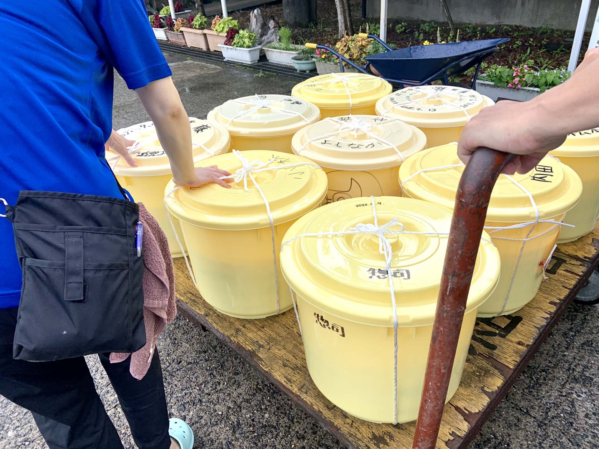 樽にご飯を詰めた鮒を重ならないように、向きを交互にし、敷き詰めていきます。その上にご飯を敷いて隙間ができないように強く押さえ、何層にもしていきます。樽の内側に敷いていたビニールを紐で縛って密閉、重石をのせます。本漬け完了です。