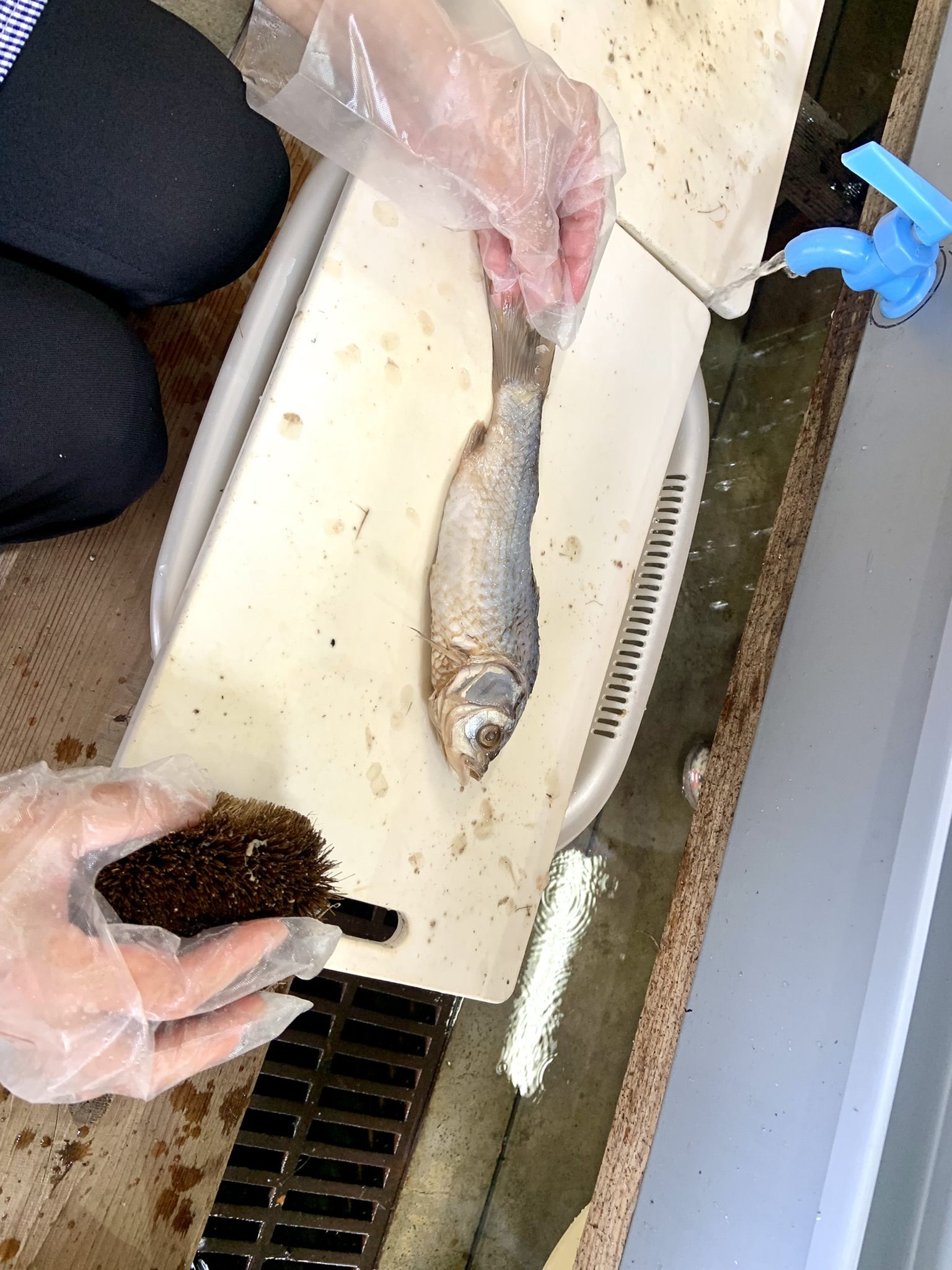 丁寧に塩を洗い流します。鮒の口から水を静かに流し込むと、お腹の中の塩も流し取れます。