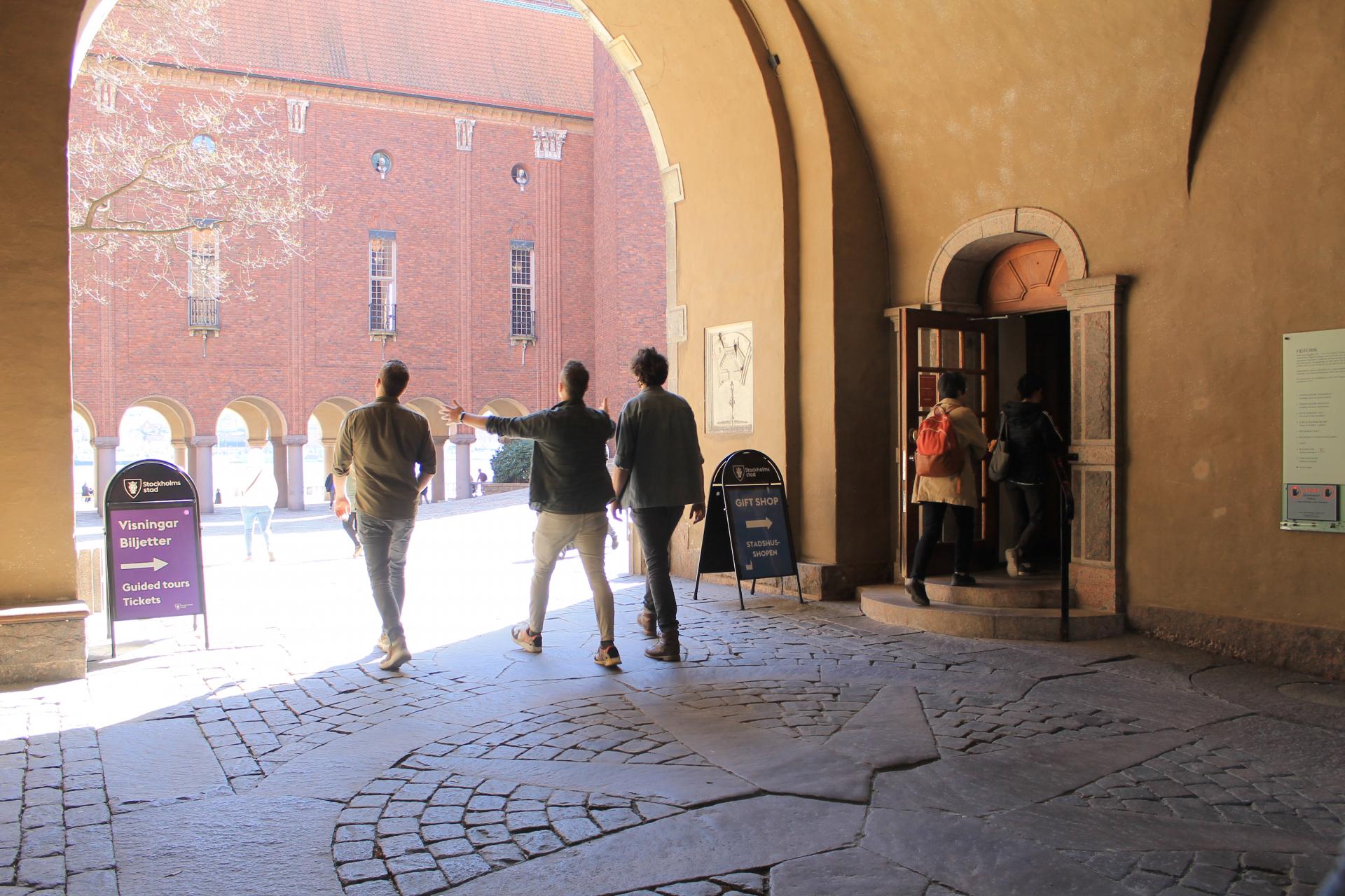 チケットを購入した売店から市庁舎中庭を通って水辺に向かっていくと、写真のとおり、左手に集合場所があります。「Tower Entrance」と書かれた案内看板がタワー入口横に立っているので、見つけやすいでしょう。開始時間の数分前になると、スタッフがやってきます。所要時間が35分であること、エレベーターも利用できるといったことや途中にはミュージアムもあるという説明を受けた後、チケットを提示して登頂開始です。
