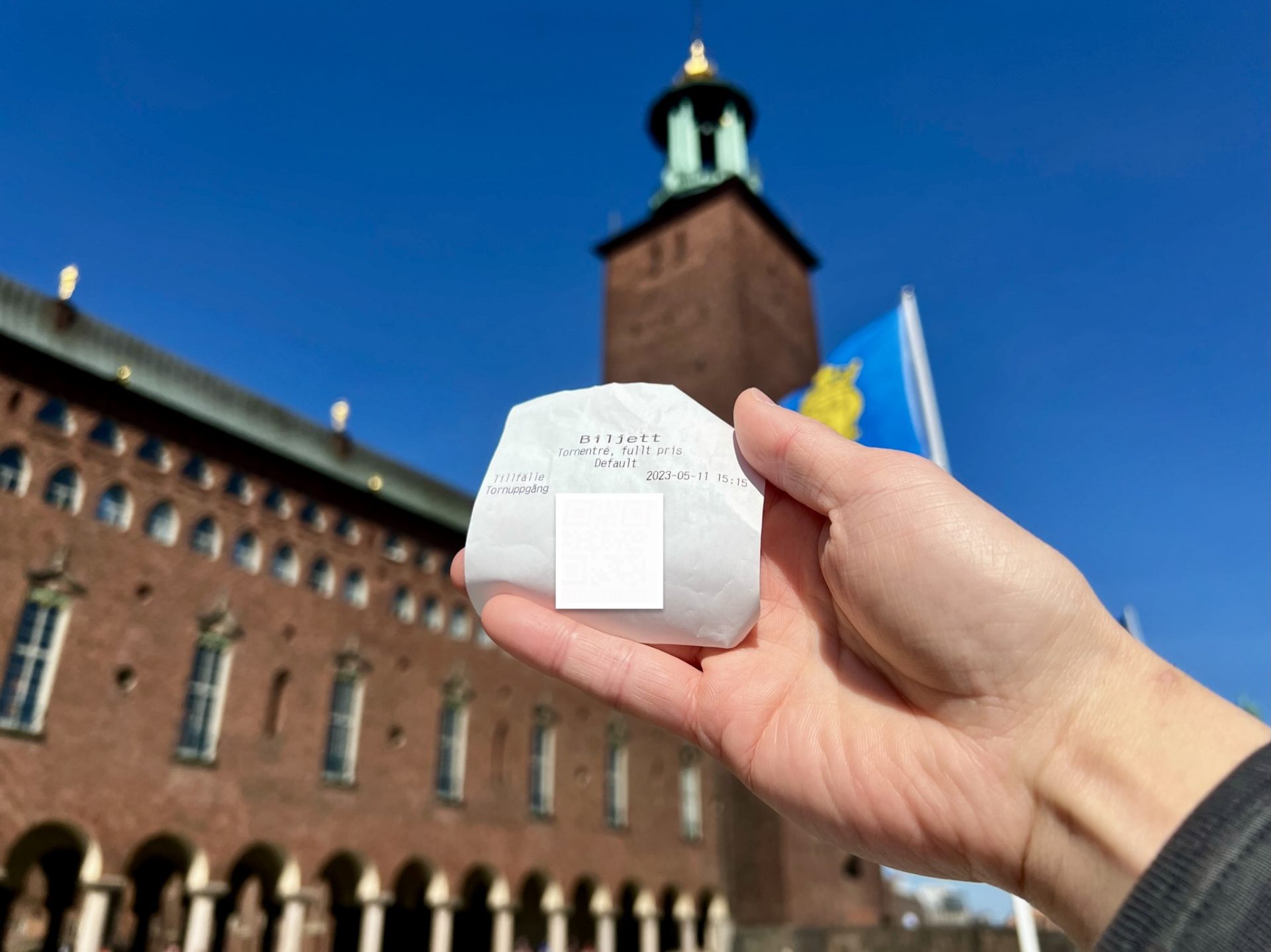 タワーチケットは、ガイドツアーと同じく市庁舎正門をくぐって右手にある売店(営業時間:毎日8時30分から16時30分)で購入できます。利用料金は、1人あたり90クローナ(約1,200円)、11歳以下は同伴者がいる場合のみ無料となります。事前予約はできないので、タワーに登る当日に登りたい時間を指定して購入することになります。