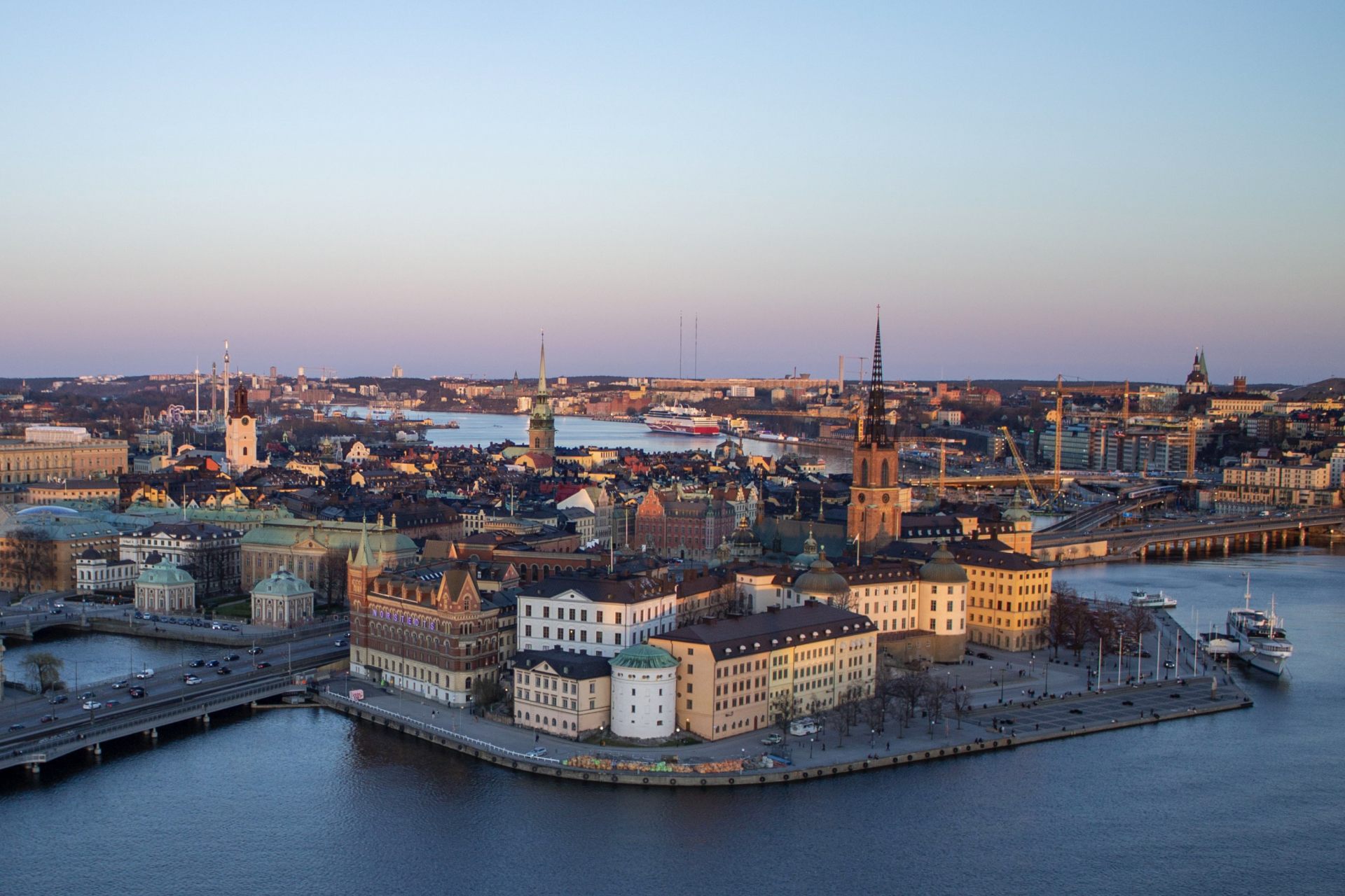 市庁舎を中心にして、見渡すことができるストックホルム市内はまた違った景色を楽しむことができます。天気が良いと、写真のように遠くまで望むことができます。ストックホルムに到着した日はここに登って、どこに何があるか位置確認をしたり、または最終日に旅のハイライトとして景色を堪能するのも良いです。