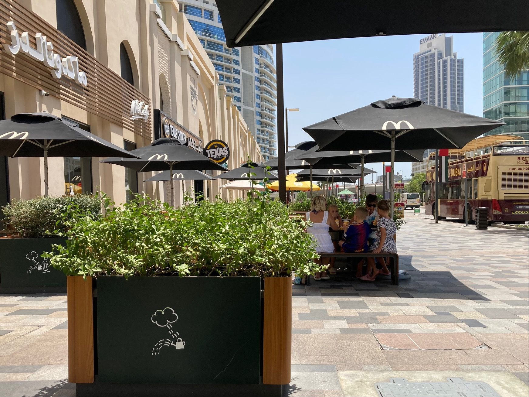 こちらはドバイの人気ビーチエリア、JBR(ジュメイラビーチレジデンス)のすぐ近くにあるマクドナルドです。黒いパラソルがスタイリッシュな雰囲気で、テラス席には緑もたくさん植えられています。ビーチで遊んだ後のご飯や休憩にマクドナルドに立ち寄るのは、もはやドバイっ子の定番!心地良い夕方頃はテラス席が大人気です。