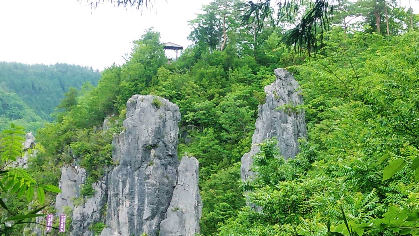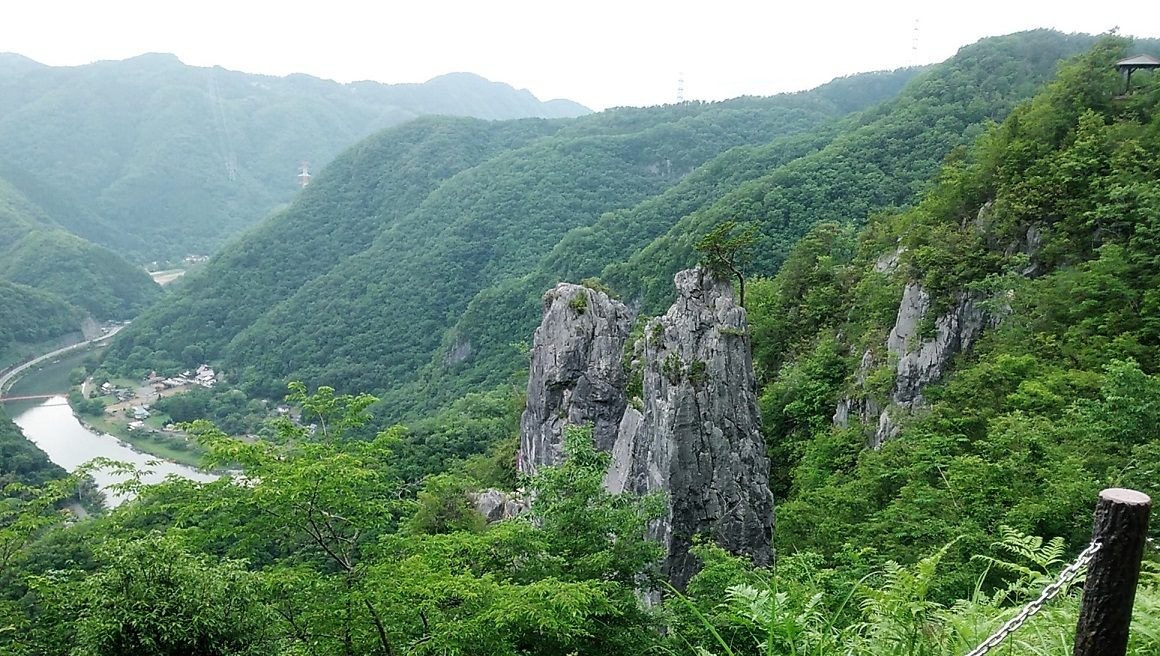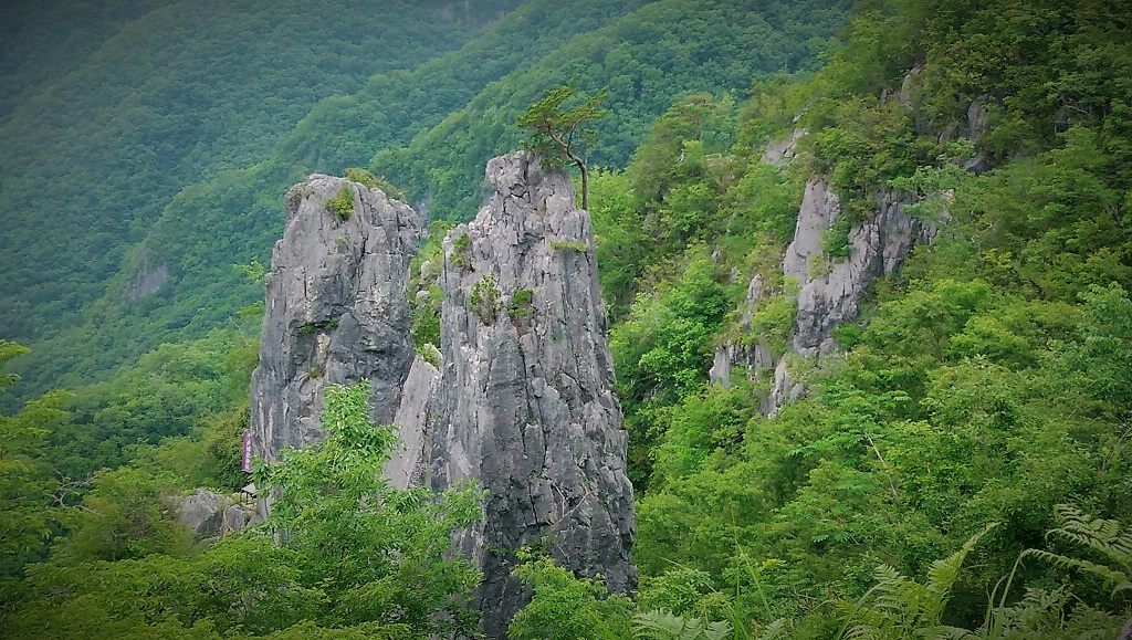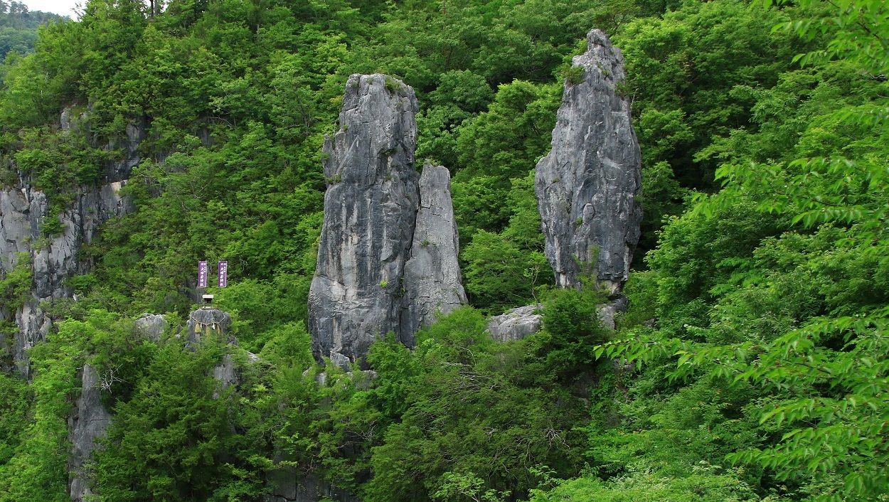 展望台から見下ろすと、新緑の山並みを縫うように流れる成羽川と奇岩の数々、自然が生み出した絶景です。