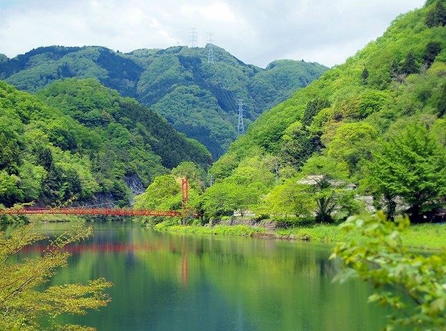 滔々と流れる成羽川と赤い橋のコントラストが美しく、この橋のたもとから山々を見上げるのも絶景です。