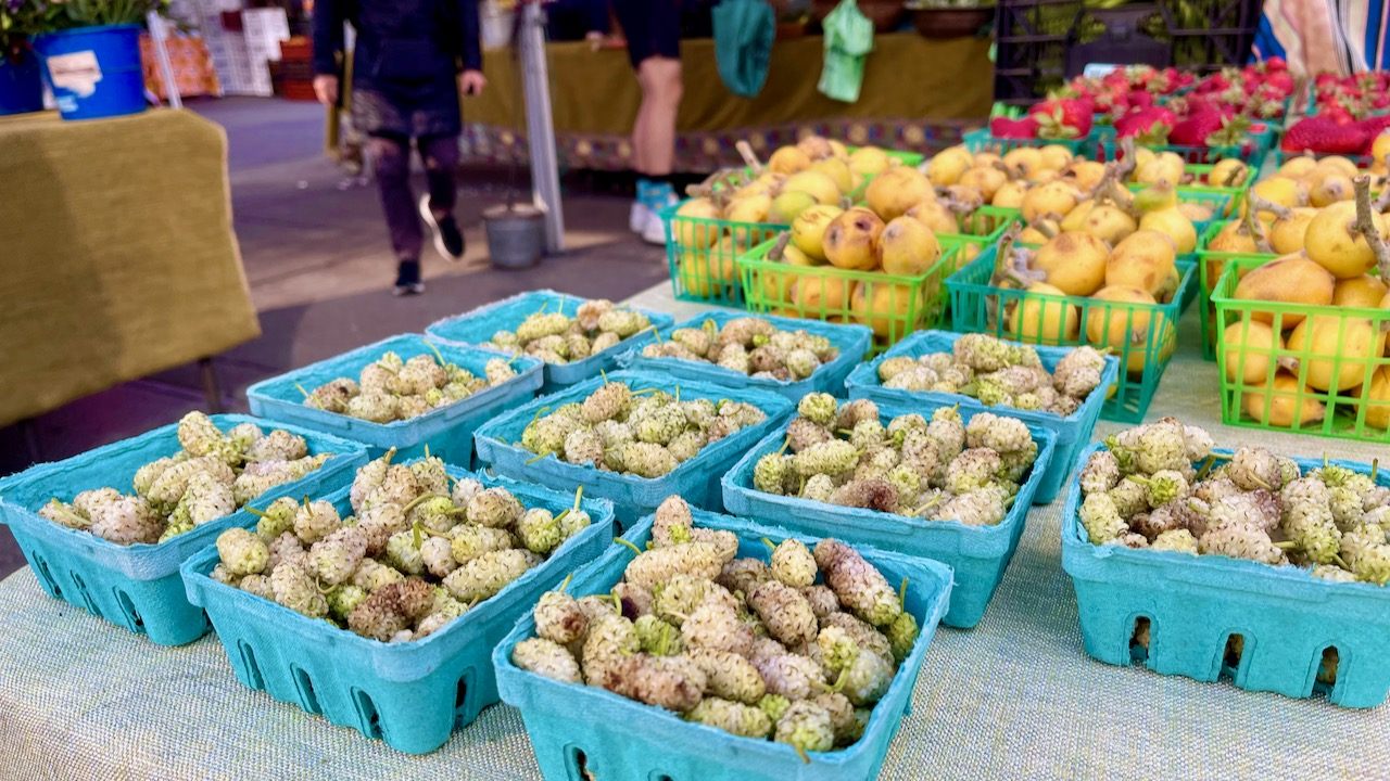 とても珍しい白い桑の実です。桑と聞くと、戊辰戦争の頃、会津藩の方がお茶と桑を持って、この地で栽培を試みた歴史を思い出します(漢字でサンフランシスコは”桑港”と書きます)葉っぱはカイコの大好物。甘くトロッとした実は私たちの大好物。200gくらいで8ドル前後、シーズンも短い高級果物です。