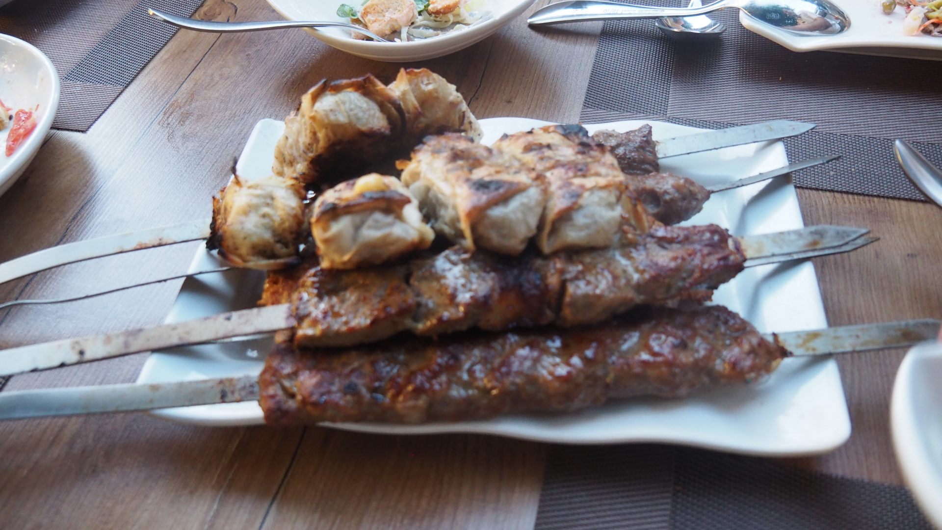 お馴染みのシャシリクです。鶏、牛、羊は定番ですが、こちらのお店ではサンブーサも串に刺されて提供されました。混雑していたからなのか、お肉はだいぶん冷めていました。牛は脂身が多く、鶏肉は固い部位が多く感じられたので、恐らく厨房のタイミングがベストではなかったのでしょう。日中の空いている時間を狙って、是非再挑戦したいです。