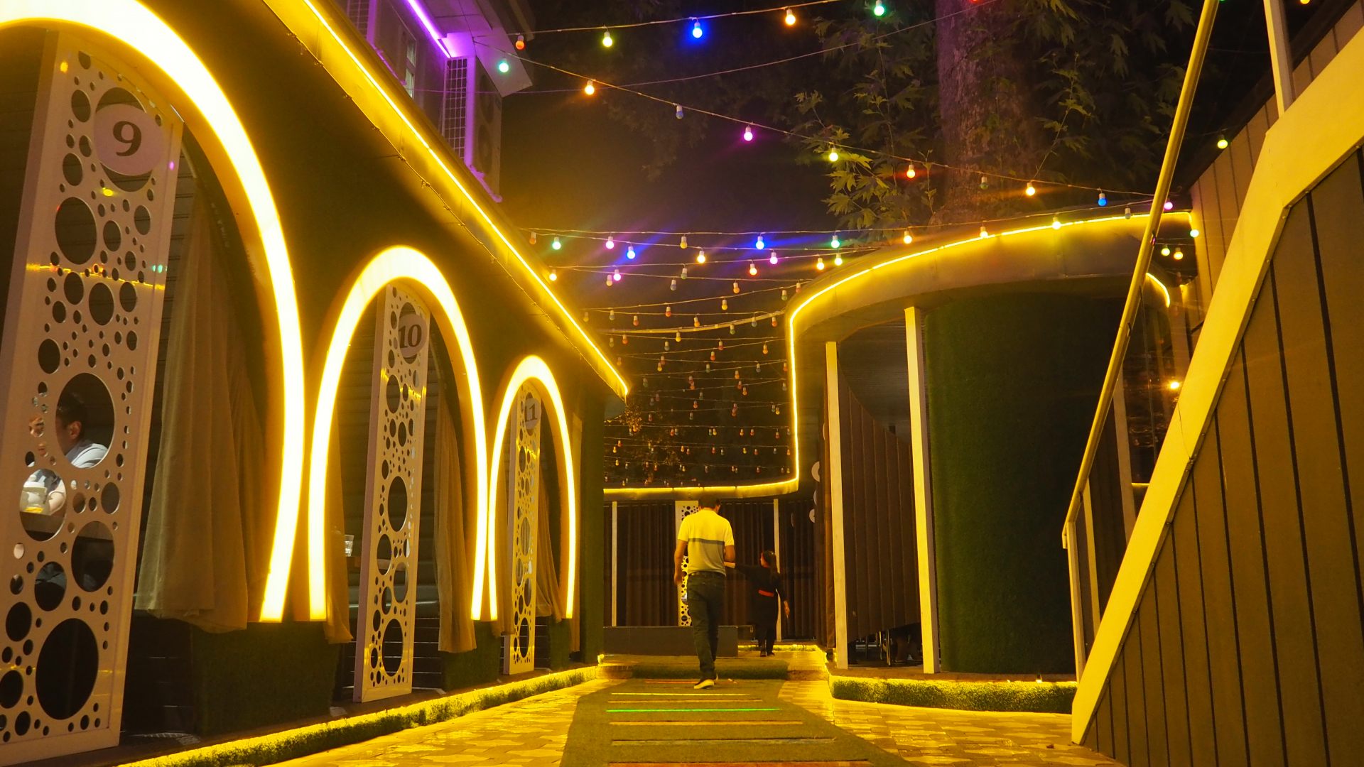 席数はかなり多く、屋外には数種類の噴水や、子どもが遊ぶことができるスペースもボールプールやトランポリンなど多々用意されています。入口付近の座席は個室になっており、喧騒を避けてゆったりと会話を楽しみたい方々にとっては有難い選択肢です。