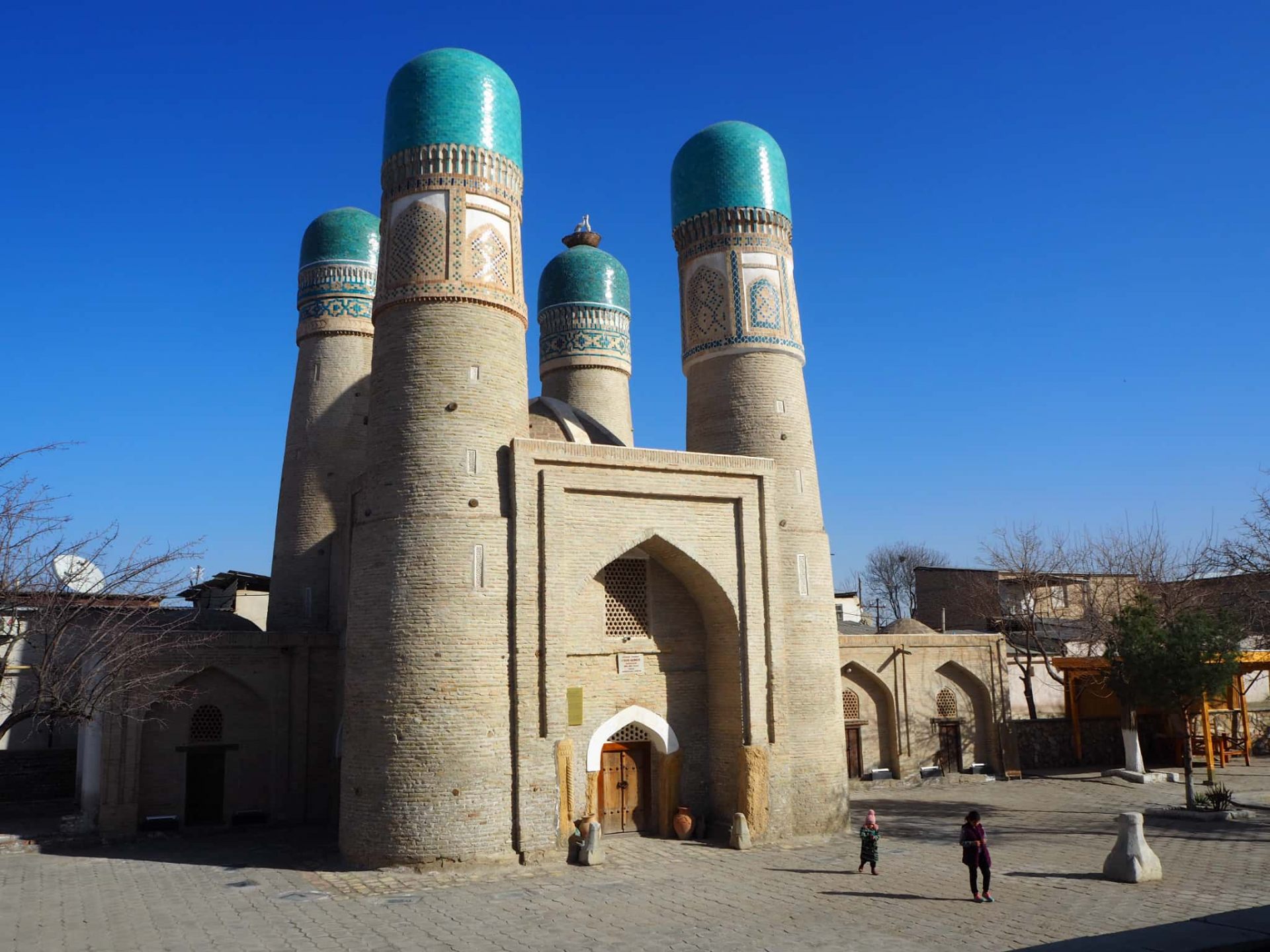 ガイドブックに載っているようなイスラム建築のほとんどはラビハウズから西側にありますが、ポツンと外れるようにラビハウズ東側に位置しているのが、4本のミナレットという意味のチョル・ミナル。その名の通り建物から4本の塔がニョキっと伸びた、他では見られないユニークな形の建築物なので、忘れずに立ち寄ってみましょう。