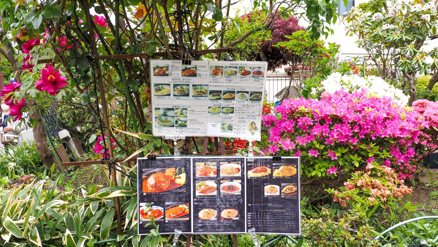 お店の入り口前には、見事なツツジやシャクヤクに囲まれたメニューが。