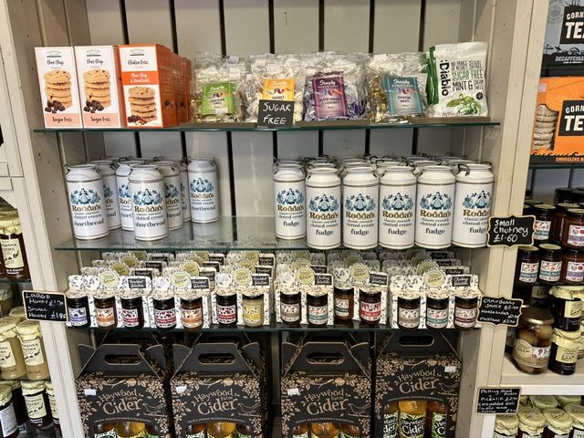そしてスコーンに欠かせない、クロテッドクリームの代表格として知られている「ロダス(Rodda’s)」社の創業地もまた、コーンウォールです。向かい側の道沿いにあったパン屋さんらしき店「ペンジェンナ・パスティーズ(Pengenna Pasties)」には、ロダスのショートブレッドとファッジ(キャラメルに似た見かけの砂糖菓子)が缶入りで売られていました。