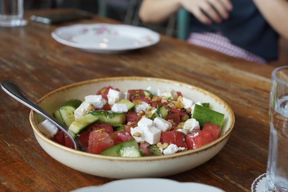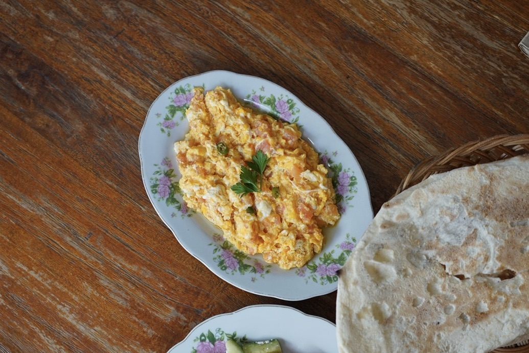 その他、見た目も爽やかな、スイカとフェタチーズのサラダや、トマトのふわふわスクランブルエッグも絶品です。カルダモンとターメリックが香るのエミラティパンケーキ「Chebab」もここで食べるべき一品のひとつ。もっちもちの生地と甘いデーツシロップが堪りません。