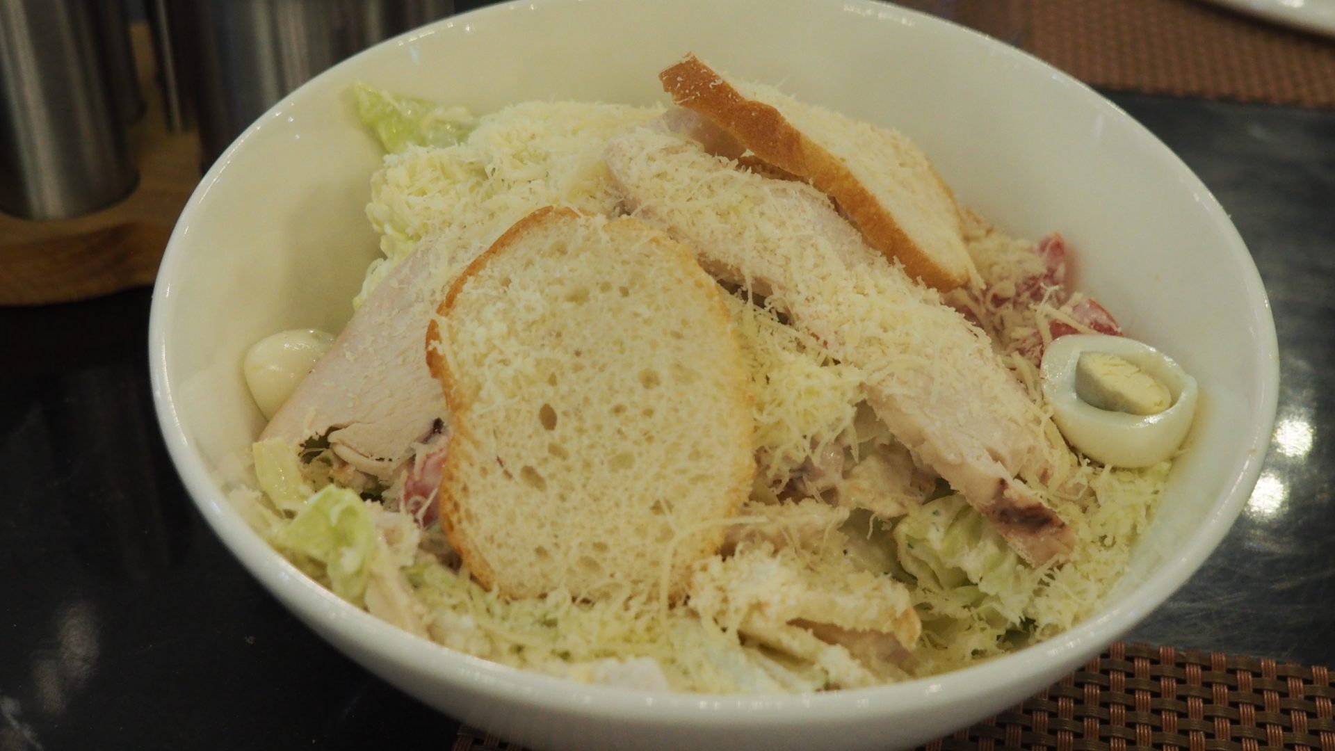 「いりません」と主張したにも関わらず、「サラダは何が良い?」と繰り返し問い続けたウェイターの功績の産物サラダです。こちらは特段代わり映えのないチキンシーザーサラダでしたが、筆者がここ最近で目にしてきたシーザーサラダと比較すると、トッピングチーズのきめ細かさは加点事項としても良いかもしれません。