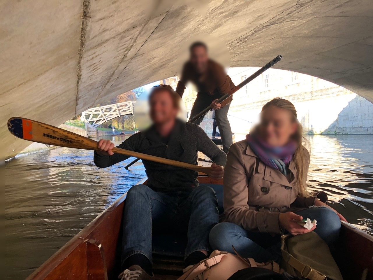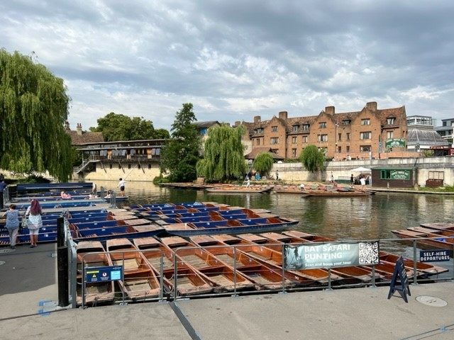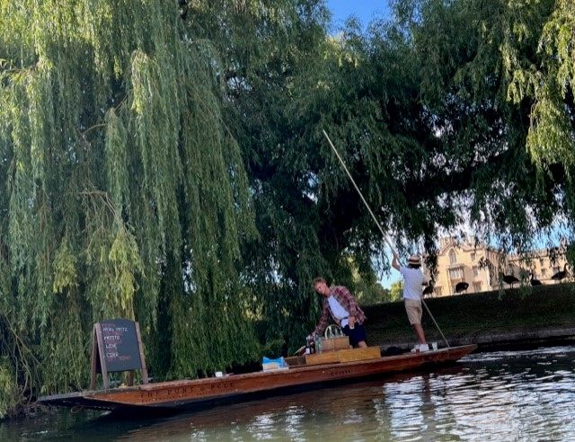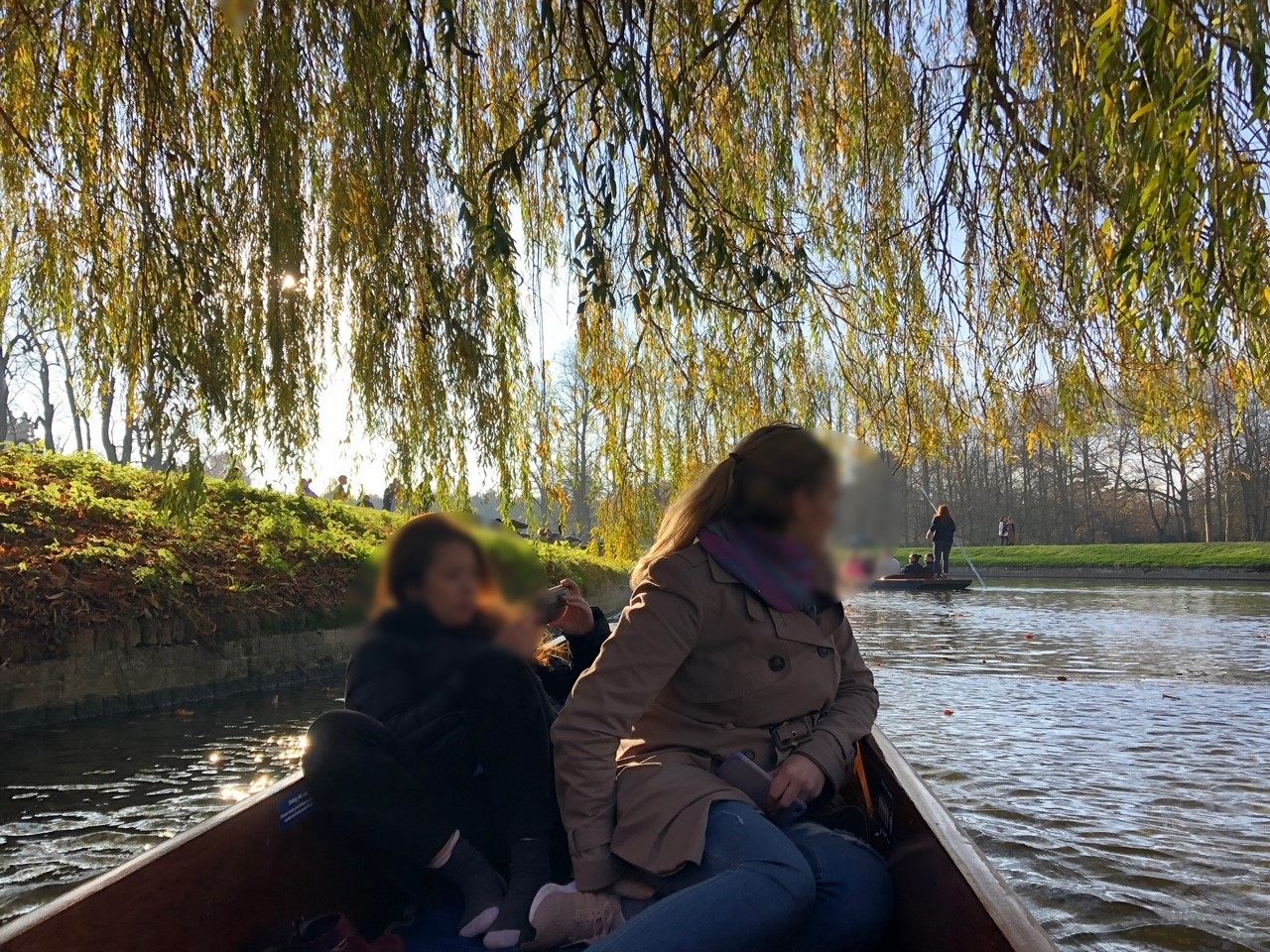 ケンブリッジを訪れて、天気が悪くなければ夏でも冬でもぜひトライしてほしいのがパンティングです。パンティングというのは小さなボートを5メートルほどのポールで操縦する川遊びのことで、ケム川沿いに沢山のパンティングの看板が出ています。中心部や川沿いを歩いていると勧誘されることも多く、少々鬱陶しいと思うこともあるかもしれませんが、このアクティビティは必須です。理由は3つありますが、一番はパンティングでしか見ることができない景色があることです。イギリスの建物の特徴として、綺麗な庭などは裏側にあるので、川から見ると閉ざされた正面玄関からは見えないたくさんのカレッジの美しい建物や景色が満喫できるのです。訪問客を受けいれていないカレッジや入場料が必要なカレッジもありますが、ボートの上からなら関係なし。二つめの理由は、歩かないで多くのカレッジを見ることができるので体力を温存できることです。(自分たちで漕ぐ場合は、当然操舵する人は疲れますけど)三つ目の理由は、ボートのスピードです。ゆーったりしたスピードでそよ風を感じながら水面近くからの目線の高さで四季折々の自然を楽しむというのはとてもリラックスできます。ということで、絶対におすすめです。船頭さんがケンブリッジの説明をしながら漕いでくれるツアー型と、自分たちで漕ぐ貸し切り型があり、どちらも楽しいです。ツアーは通常、行って戻って40-45分程度となっています。友達同士で行く場合は自分たちで交代で漕ぐのがいいと思います。パンティングは慣れればそれほど難しくなく、基本的にはポールで川底を押して進む形です。慣れるまでは他のボートにぶつけたり、ポールを川に落としたりしないように気を付けてくださいね。(それはそれで旅の思い出ですが!)