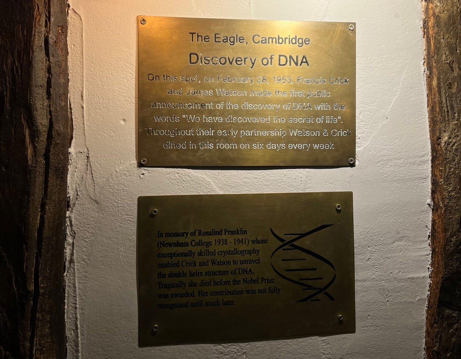 また、キングス・パレードの近くにある「ザ・イーグル」は1667年に開業した歴史あるパブで、建物も古くて雰囲気がありますが、このパブが有名なのはとてもケンブリッジらしい理由からです。というのも、1953年にケンブリッジの研究者がDNAのらせん構造を発見したと発表した場所だから。(研究所が近かったためによくこのパブでランチをしていたそうです。)現在もザ・イーグルの一角にはこの世紀の大発見を記念したゴールデンのプレートが残されています。また、ザ・イーグルには第二次世界大戦にまつわるエピソードもあります。当時アメリカとイギリスの空軍パイロットが自由時間を過ごす場所だったこちらのパブでは、キャンドルやライターを使って自分の名前を天井に焼き付けるのが流行ったそう。その後天井の汚れで見えなくなってしまっていたそうですが、清掃した際に「再発見」され、現在は歴史として保存されているそうです。また、ゴースト・ストーリーもあり、ガーデン側の二階の窓は常に開けっぱなしにしないといけないとか。というのも300年ほど前に火事で逃げ遅れた子供たちの幽霊が住み着いていて、窓が閉じていると奇妙なことが起こるから、なんだそうです。さて、今日はどのパブにしましょうか?