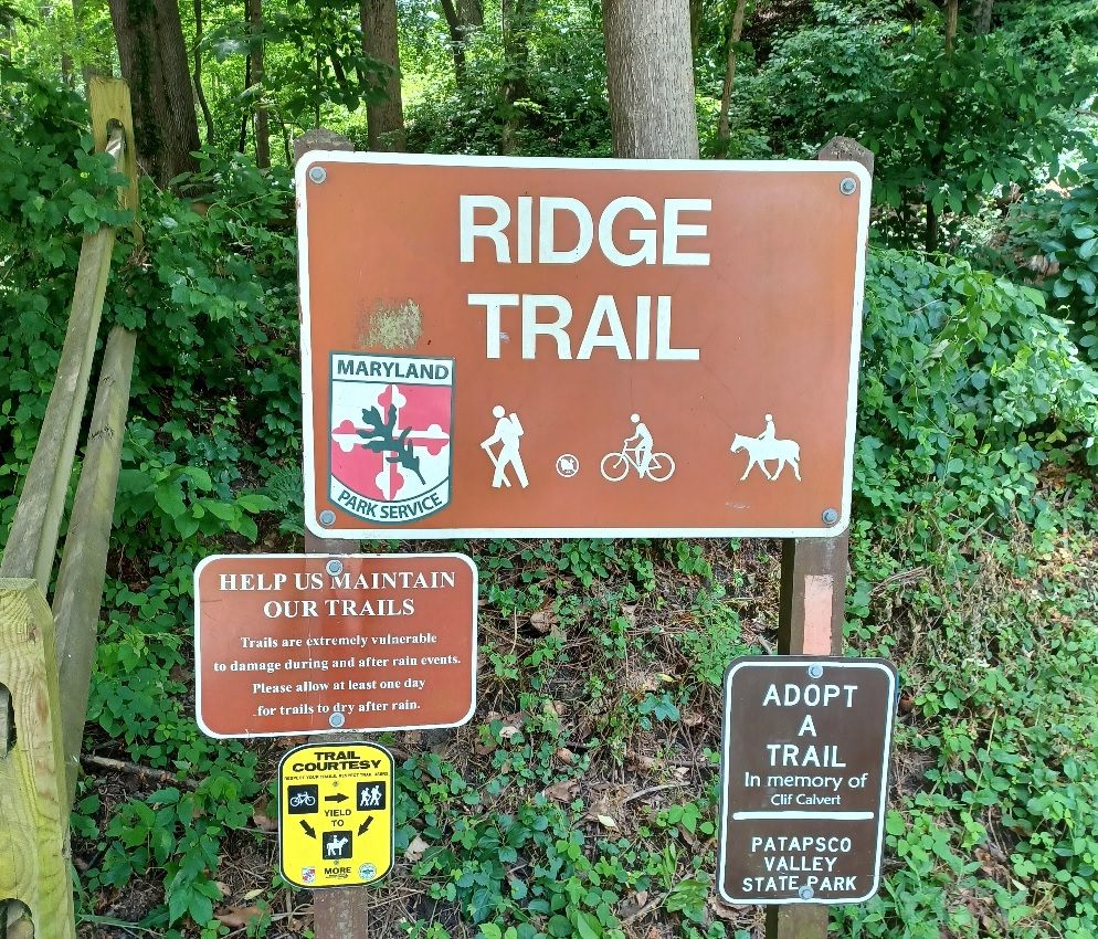 メリーランド州のトレイルには馬でも(乗馬で)乗り入れできると標識があります。(メリーランド州は競走馬の産地としても知られています)パタプスコ州立公園のトレイルには、実際に馬の<落とし物>がトレイルの途中にありました。