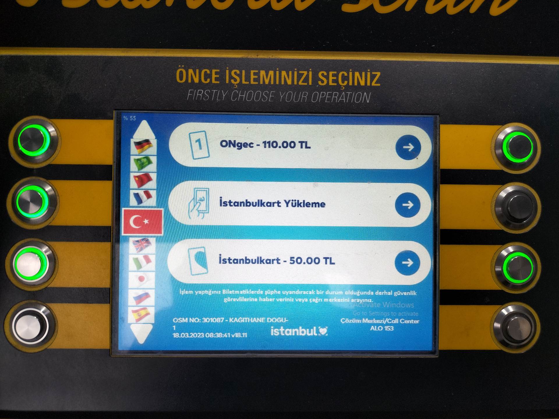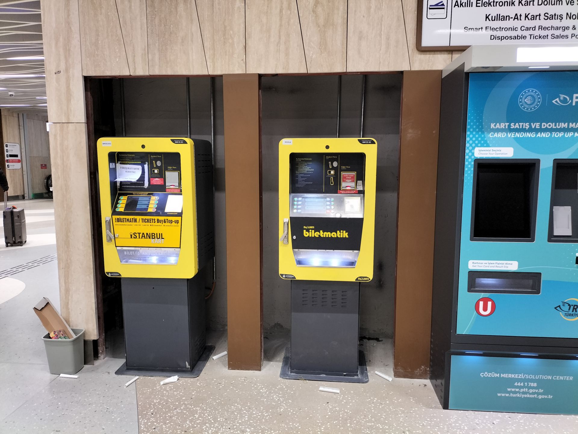 改札口の反対側に券売機が設置されているので、事前に料金の支払いを行います。筆者は50リラ (約274円) でイスタンブール・カードを1枚購入し、少額紙幣を複数回に渡りチャージしながらメトロを利用しました。券売機の操作には英語の他、日本語の選択も可能です (2023年8月時点)。