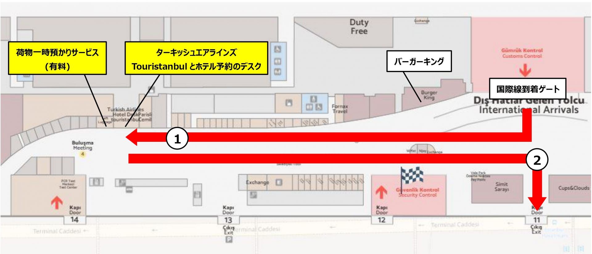 イスタンブール空港に着陸後、入国手続きを終えて荷物をピックアップすると1階の到着ロビーに到着します。向かって右手 (バーガーキングのある方向) 側に延びる通路をつきあたり付近まで進む (図の①参照) と、右手にターキッシュエアラインズの無料観光ツアーやホテルを手配してくれるデスクがあります。このデスクのすぐ左隣には荷物預かりデスクがあります。筆者はこちらのサービスを3つの異なる機会に利用しましたが、特段サービスに問題はありませんでした。