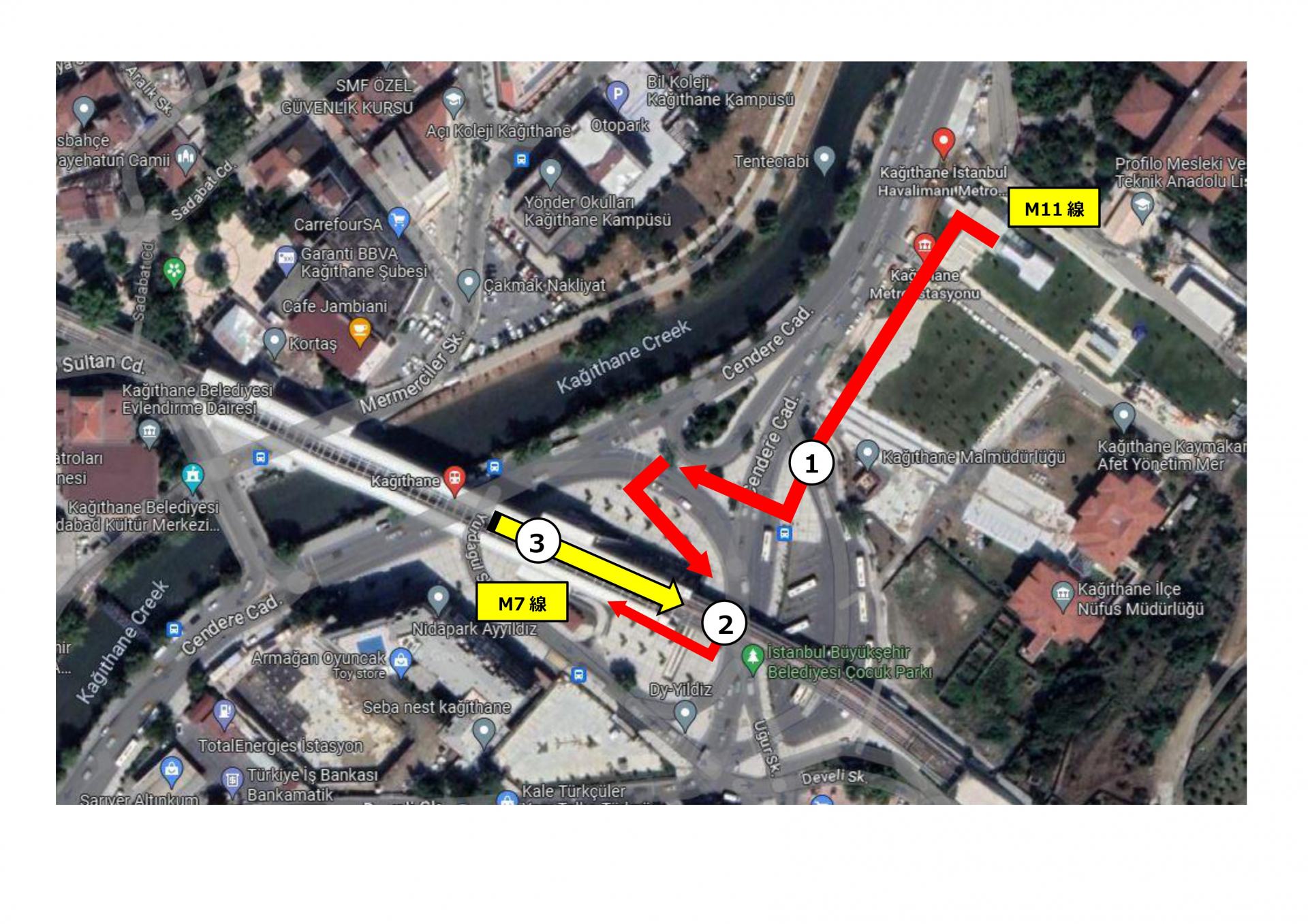 キャウトハーネ (Kâğıthane) 駅に到着し地上階に上がると、乗り換えのためM7線の駅へ移動する必要があります (図の①参照) 。M7線の駅では、向かって左側のエスカレーターでプラットフォームに上がります (図の②参照)。メジデイェキョイ駅 (Mecidiyeköy) 方面に向かう必要がありますので、進行方向をご確認ください (図の③参照)。
