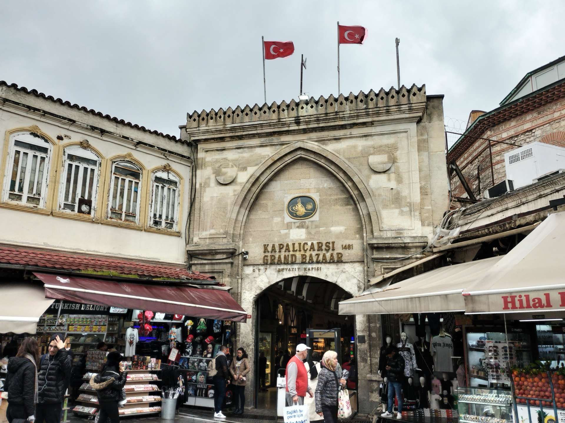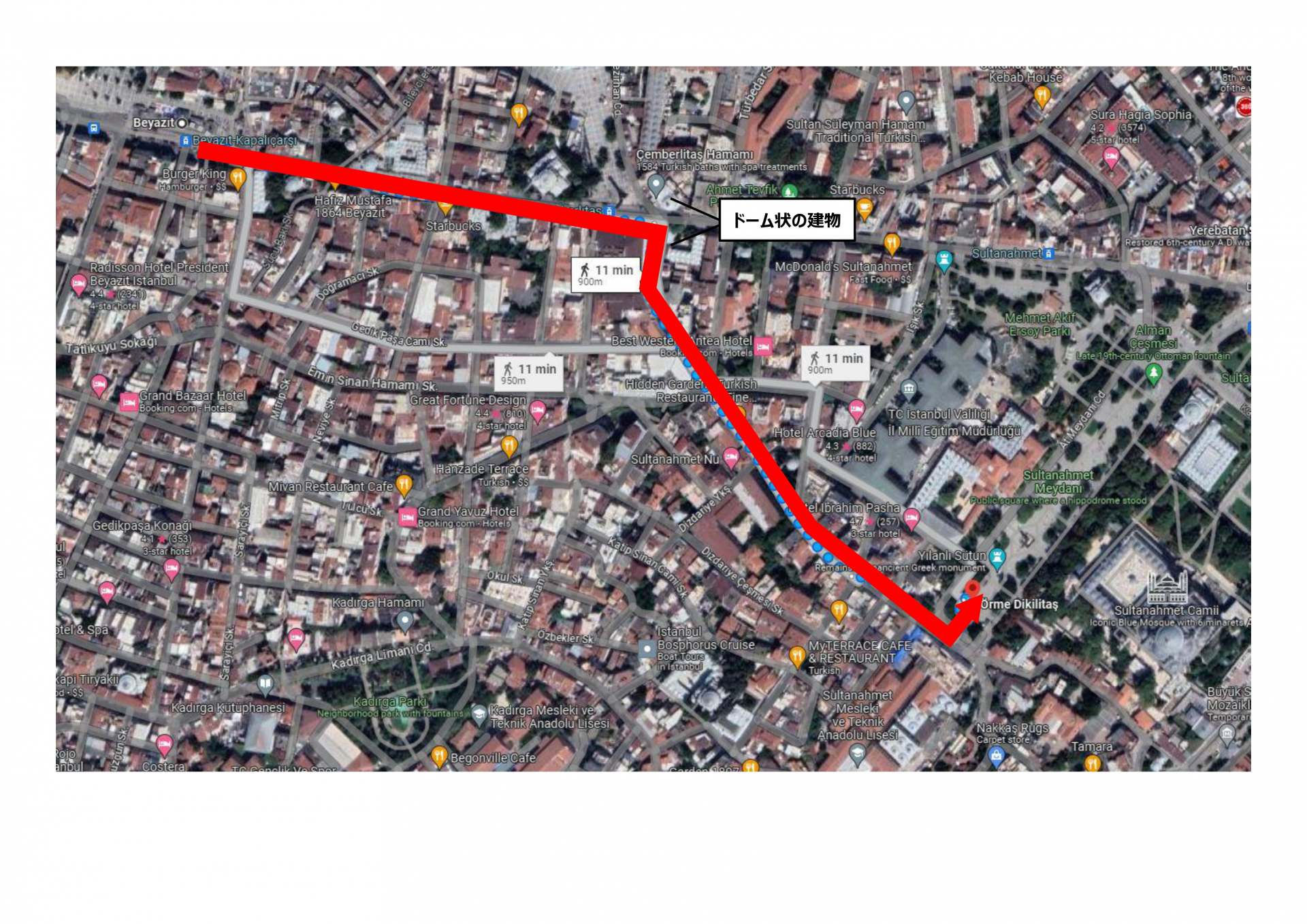 1区間の乗車でグランド・バザール (Beyazıt-Kapalıçarşı) 駅にて降車します。徒歩で臨む場合の最短距離は約1kmで所要時間は約10分です (図の③参照)。