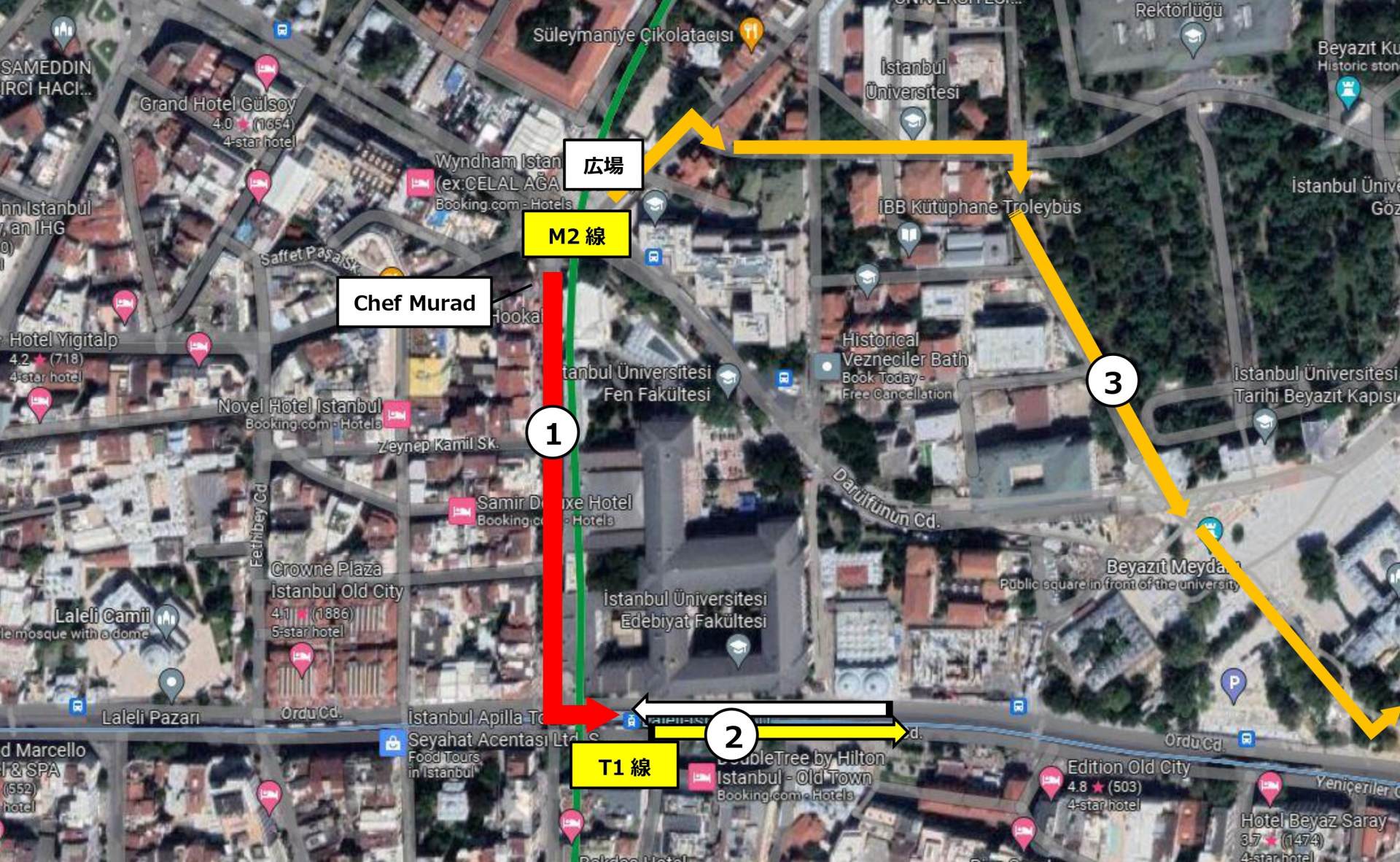 ヴェズネジレル (Vezneciler) 駅から地上に上がると、突然地元感の溢れる街並みの中に浮上するので、方向感覚を養うのがやや難しいかもしれません。地上に足をつけたら、道路を挟んで広がる小さな広場とは逆方向に進路を定め、「Chef Murad」という看板を掲げる飲食店が面した通りを下りましょう。270mほど通りを南下し (図の①参照)、左折すると、車道の真ん中に路面電車の駅があります。進行方向は東ですので、黄色の矢印側の停留所から乗車します (図の②参照)。