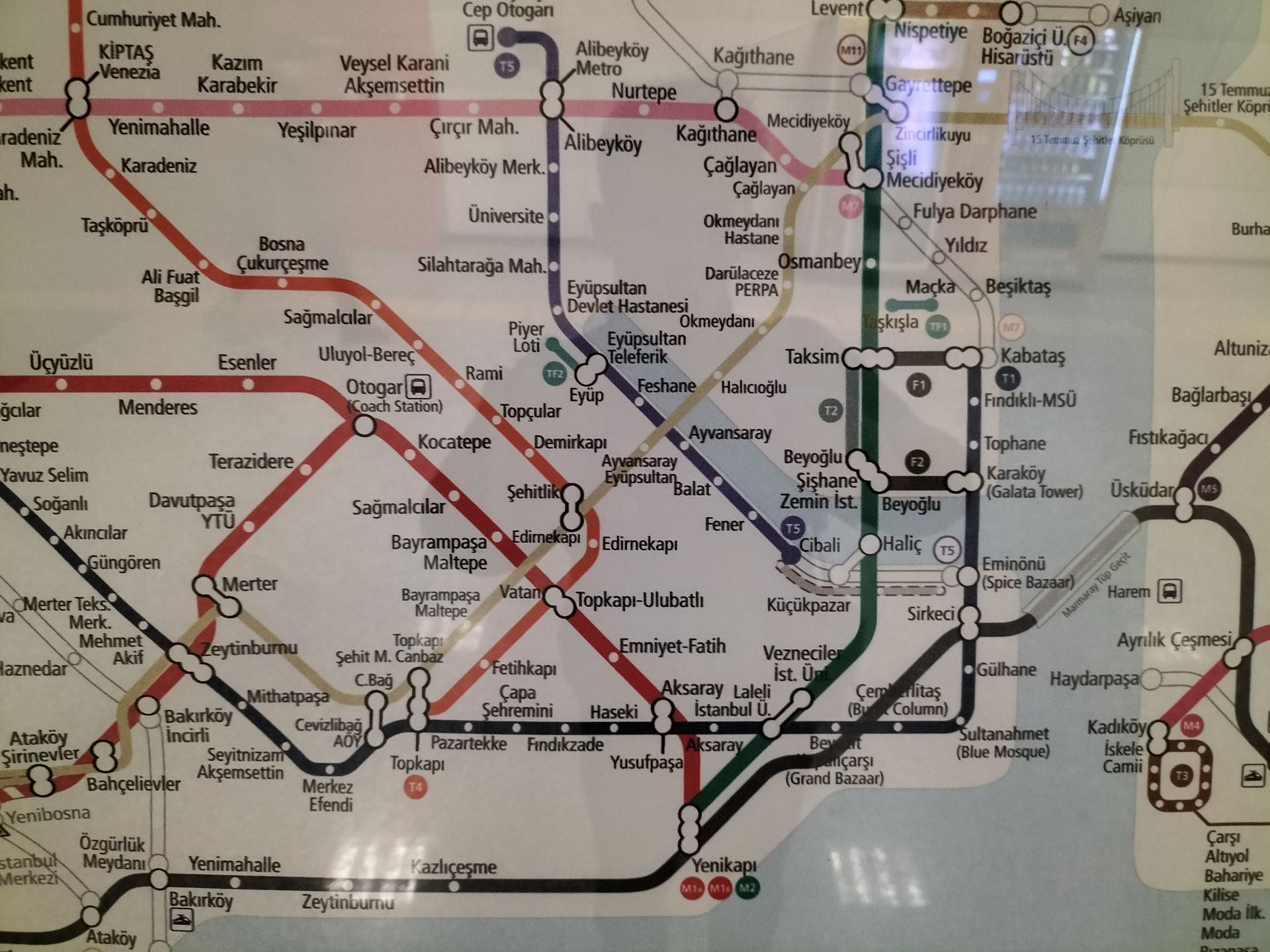無事にM2線のシシリ=メジデイェキョイ (Şişli Mecidiyeköy) 駅に辿り着いたら、イェニカプ (Yenikapı) 方面行きの電車に乗車し、ヴェズネジレル (Vezneciler) 駅まで約20分間電車に揺られます。