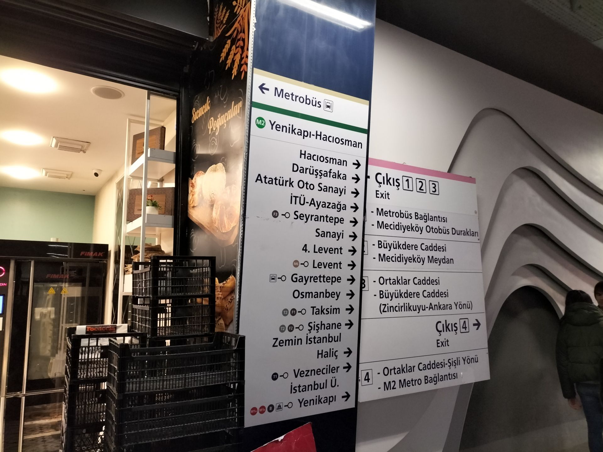 イェキョイ (Mecidiyeköy) 駅はキャウトハーネ (Kâğıthane) 駅の2駅先なので、約5分で到着します。駅構内の案内に従い、徒歩でM2線のシシリ=メジデイェキョイ (Şişli – Mecidiyeköy) 駅を目指しましょう。M2線は緑色です。