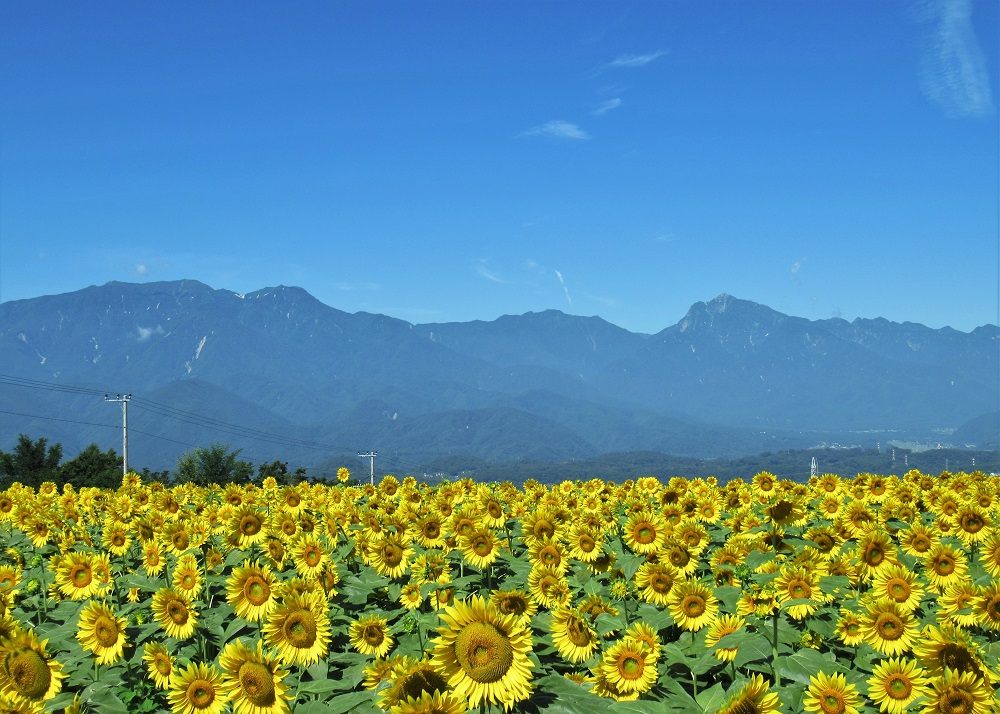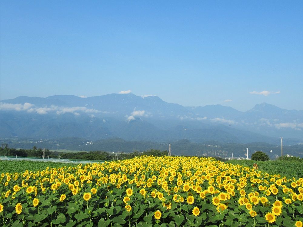 トップの写真のように、南アルプス連峰が迫るように望める最高のロケーションの高台に、ひまわり畑が13ヶ所点在し、時期をずらして咲いていきます。