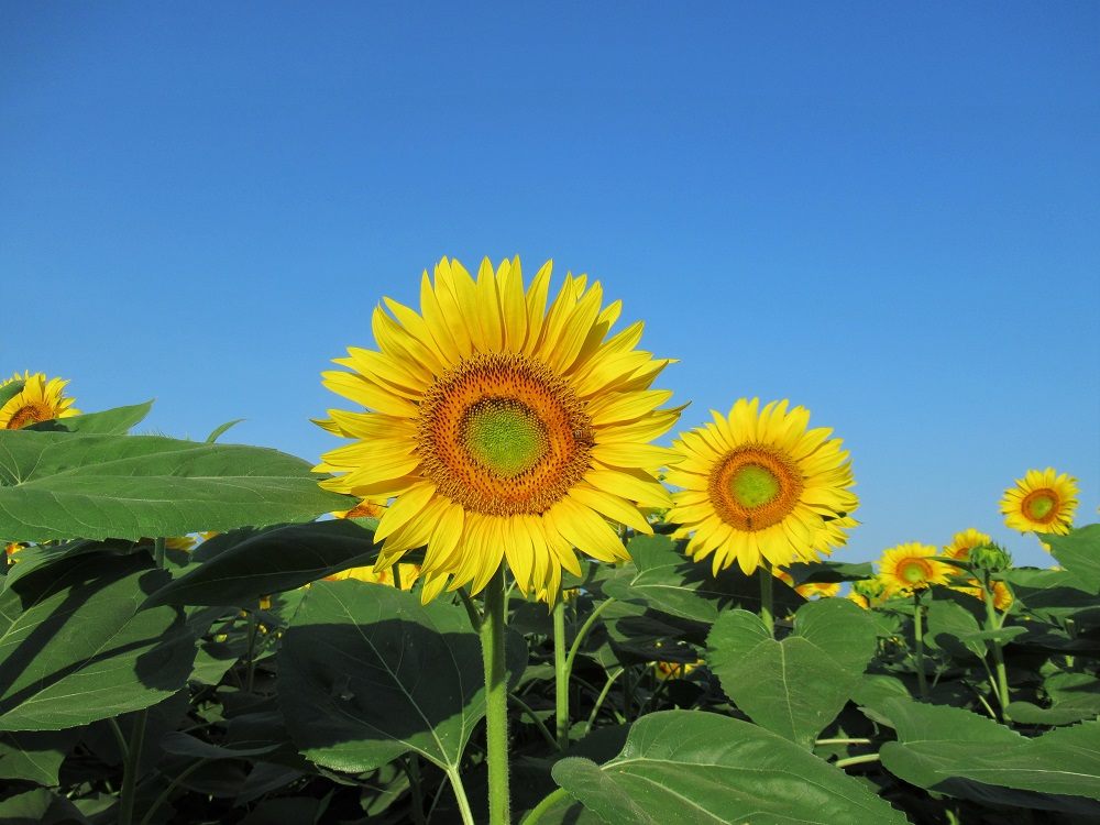 太陽に向かって咲くビタミンカラーのひまわりの花。