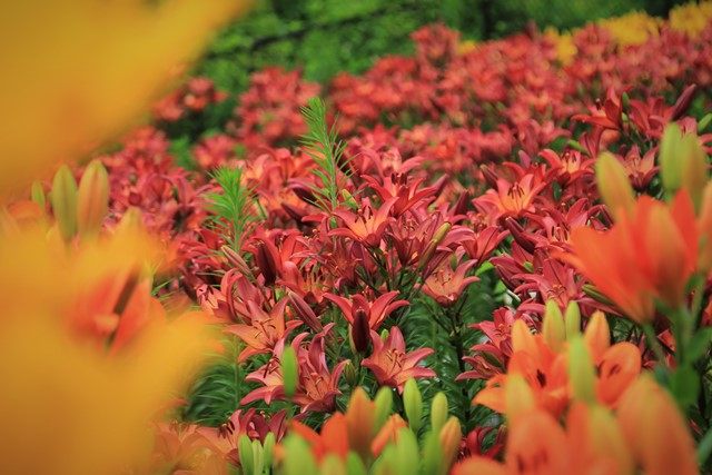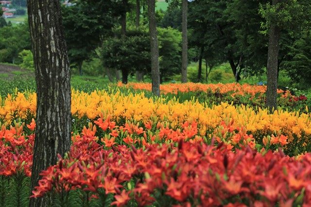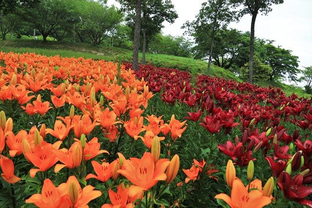 続いて、駐車場北側にある「ゆり園」の様子を伺います。なだらかな山の斜面に32種類・約35,000本のゆりが植えられており、目下、早咲きの種が見頃を迎えています。
